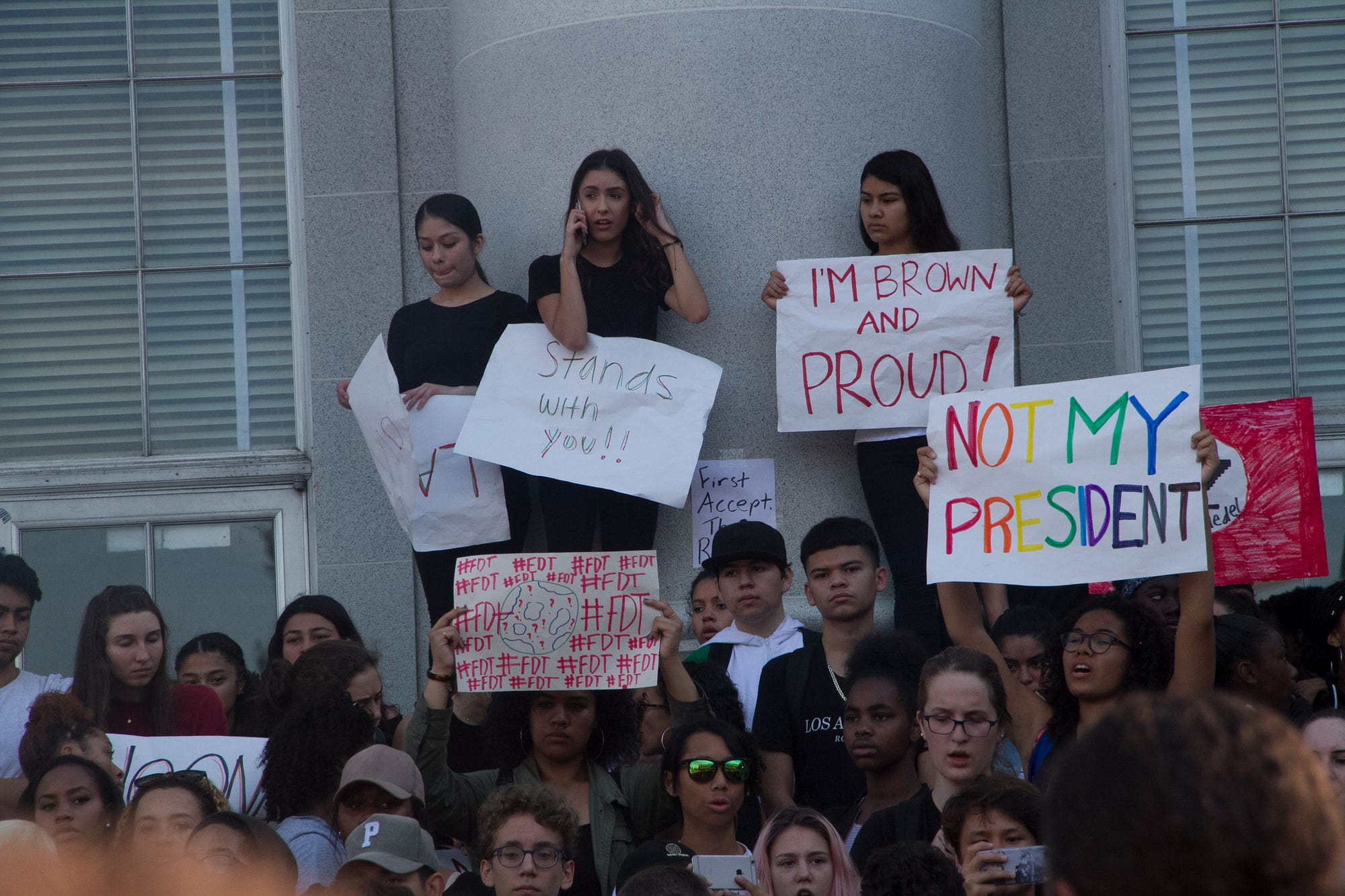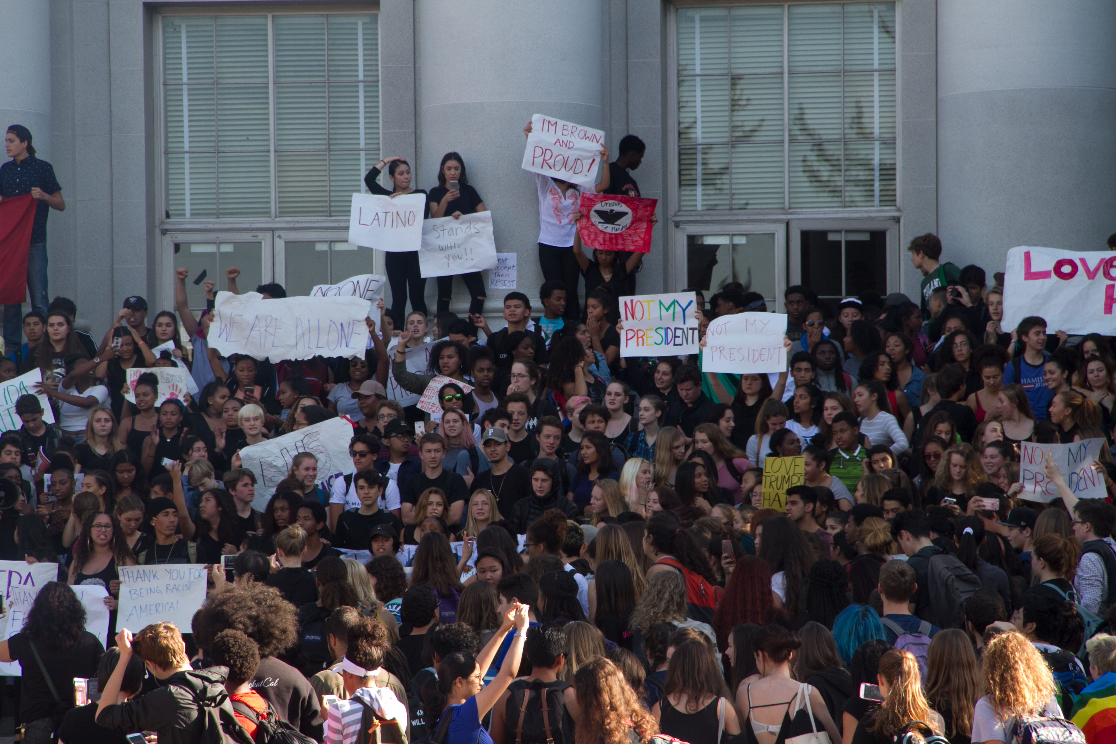 At 9:30 a.m. this morning, students from Berkeley High School in downtown Berkeley staged a walk-out in protest of Trump’s presidential victory last night. The Los Angeles Times is reporting that the number of students involved is as high as 1,500, or one-half of the student body. The vocal yet peaceful group of students marched from the high school down to Sproul Plaza on the UC Berkeley campus, with the Berkeley police directing traffic at intersections as they passed through. Helicopters beat overhead while the students marched.