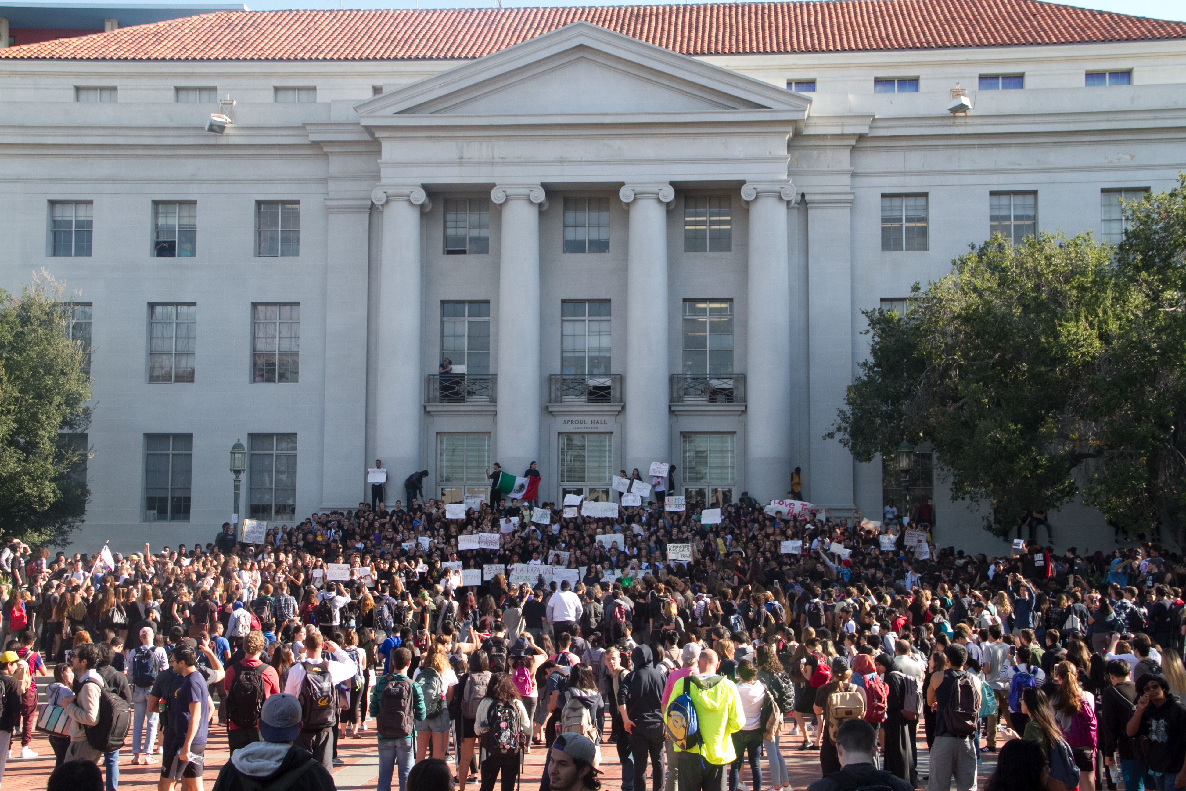 The students were joined by university students at Sproul Plaza — the same gathering place as the student uprisings of the 1960s, and where Mario Savio gave his own protest speech in 1964.