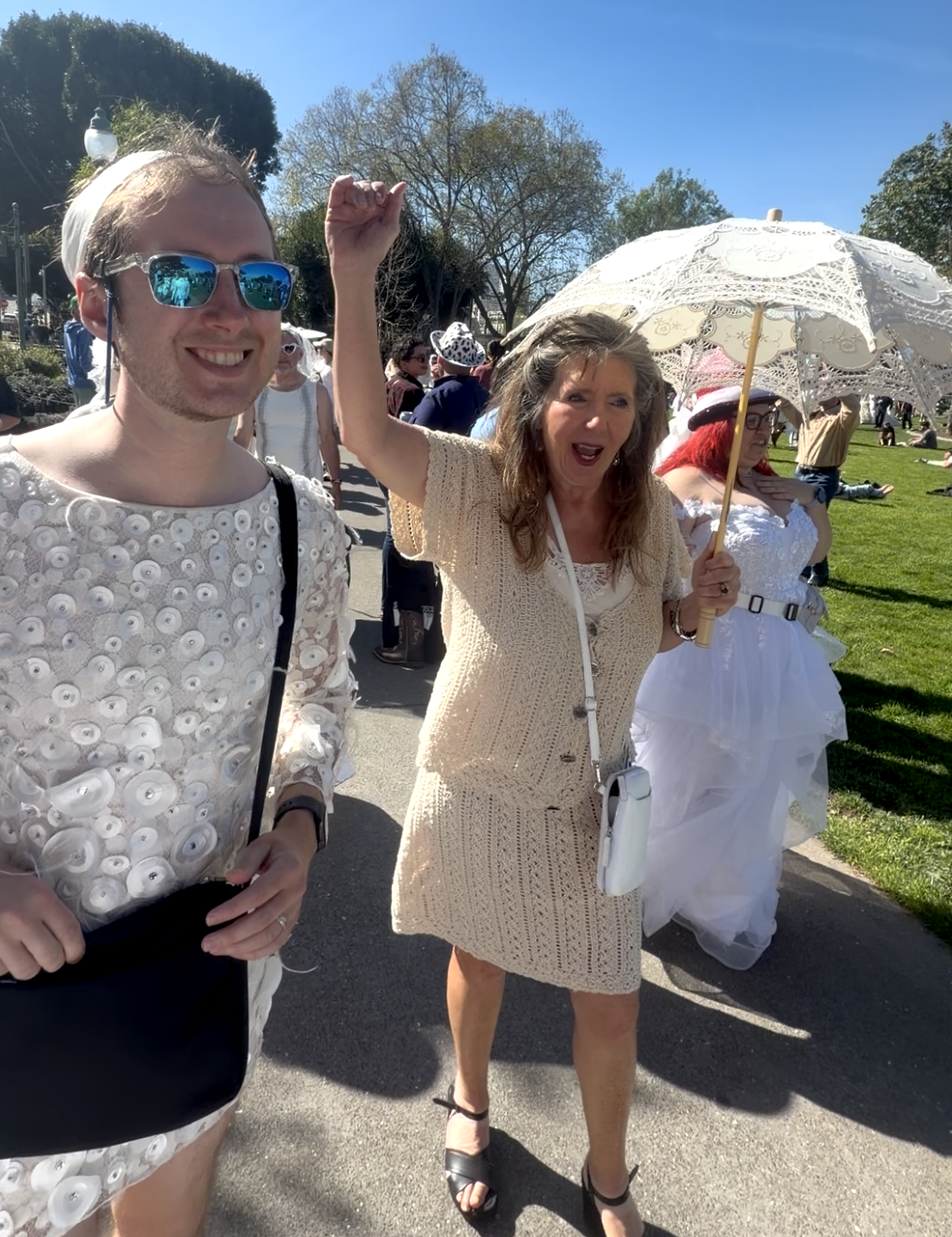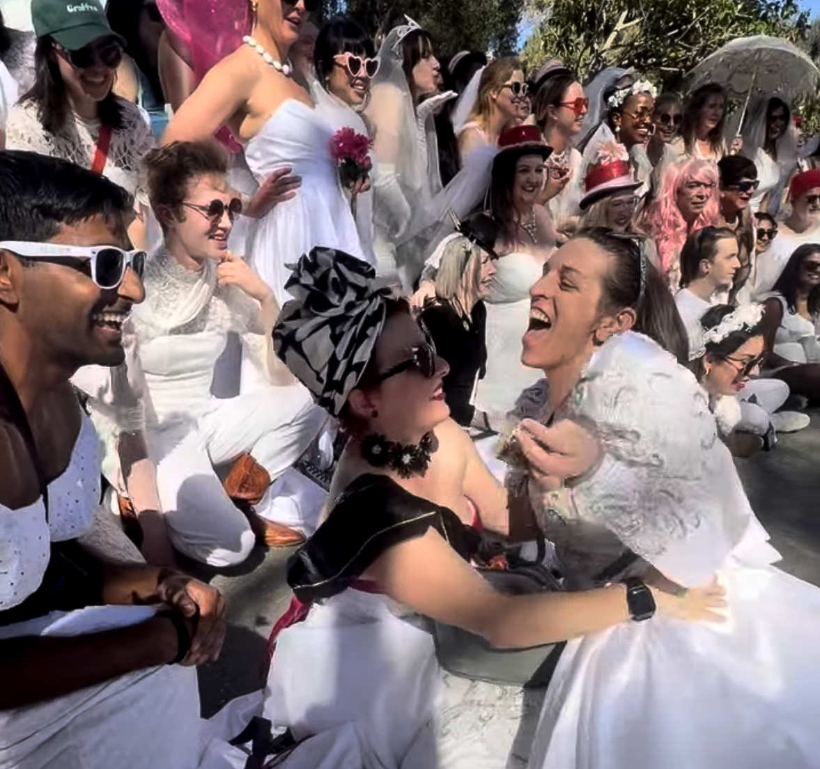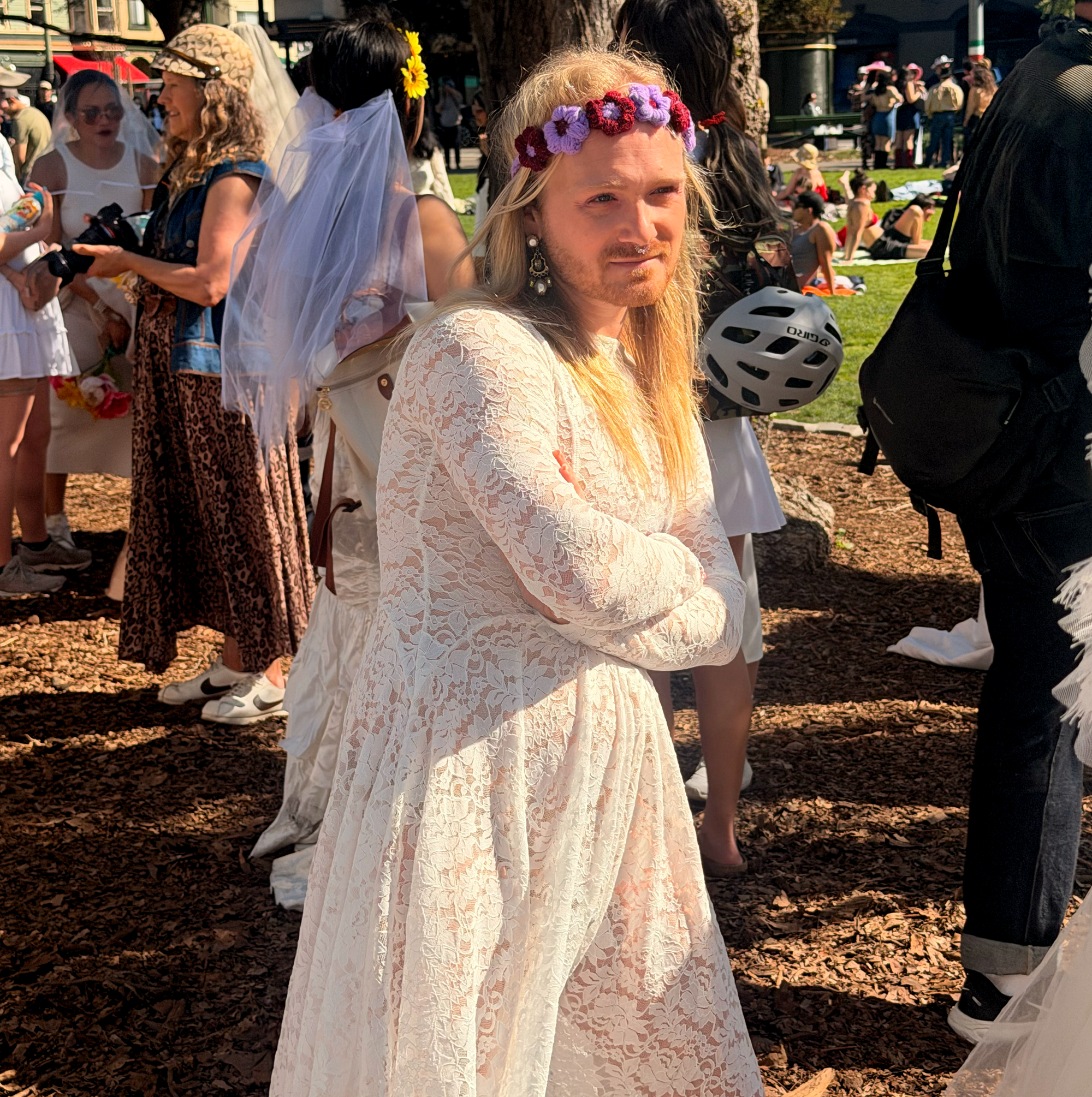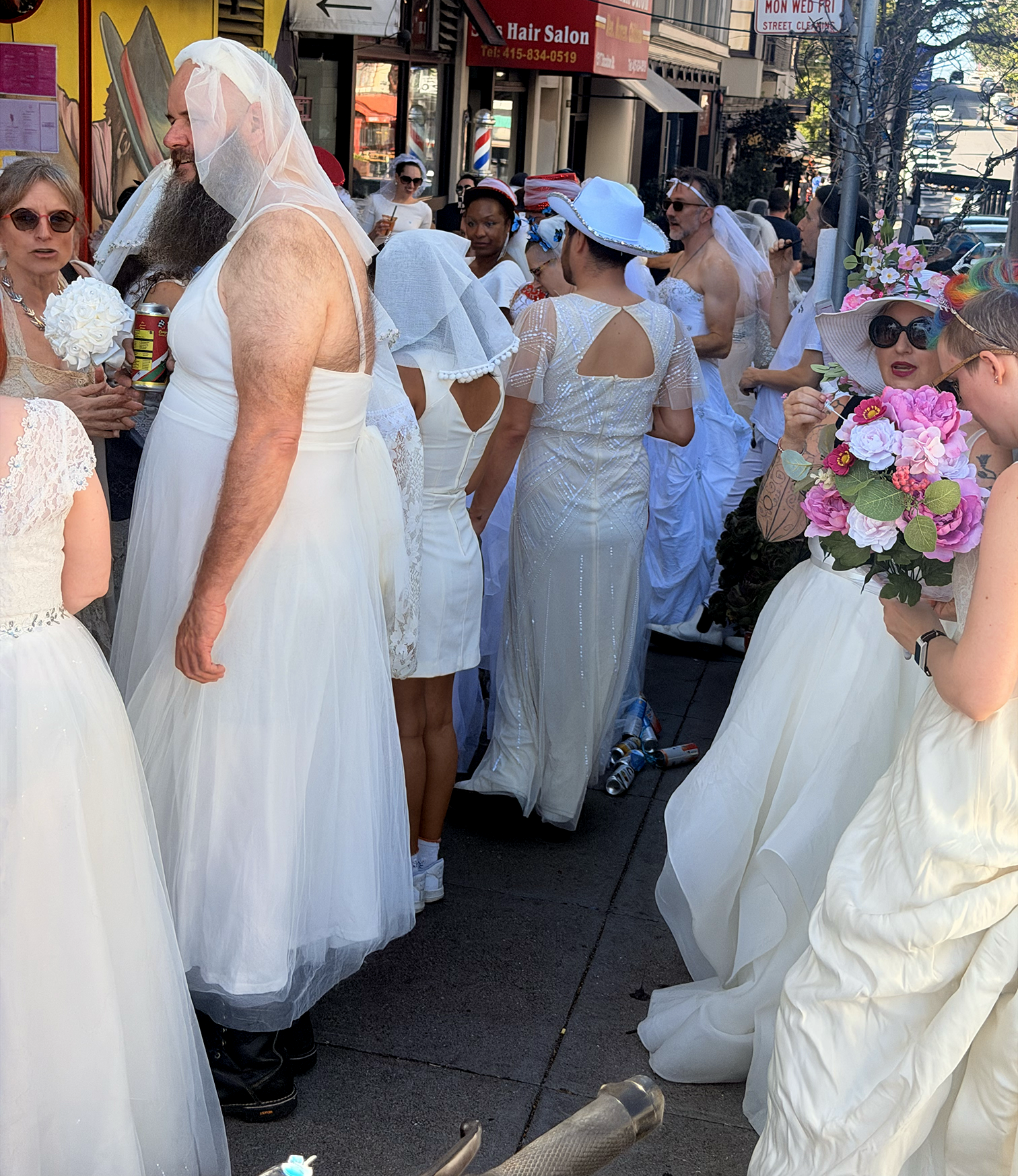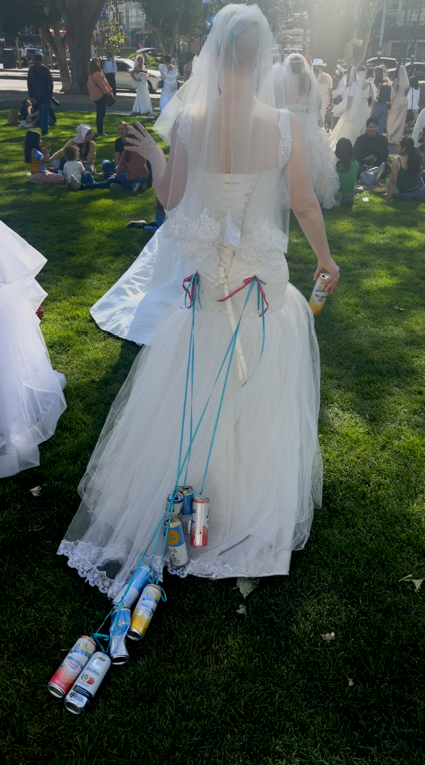 Saturday was a gorgeous day for a wedding. A gloriously sunny afternoon that seemed personally ordered for the occasion, the kind of San Francisco weather that makes you forgive the fog for the other 300 days of the year. The brides gathered in Washington Square Park in front of Saints Peter and Paul Church, and I use the word "brides" loosely and lovingly: all genders, all ages, all manner of thrift store gown. Some dresses were pristine. Some were held together by optimism. Everyone looked incredible.