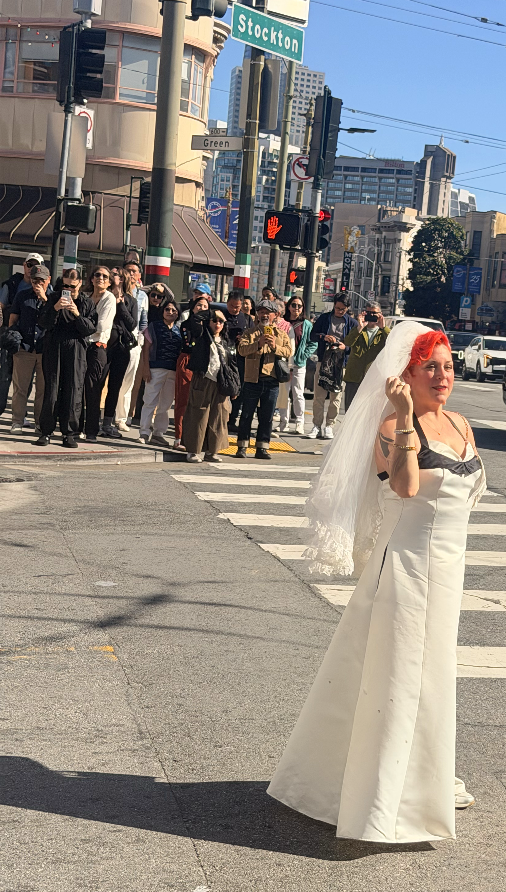 No one was riotously messy. No one was picking fights or harassing passersby. The bar, as it were, was low, and the brides cleared it by a mile in their thrift store trains. It was just people having a genuinely good time, sipping rosé in the North Beach sun, being ridiculous and warm and exactly the version of San Francisco that people claim doesn't exist anymore.