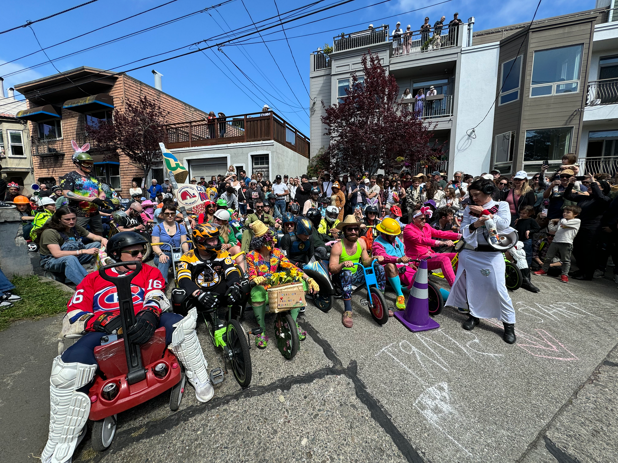 Every year on Easter Sunday I clip on my walkie-talkie and join over two dozen volunteers as a cacophony of hollow plastic wheels echoes against the Victorian and Edwardian façades of the homes on Potrero Hill. After paying homage to the city permitting gods, and in every kind of weather, we keep a careful eye as hundreds of riders gather for the opportunity to sit astride a Big Wheel and throw caution to the wind as they pitch themselves down the serpentine street and let gravity do the rest. Pads and helmets are optional, but signing a liability waiver is required: You ride at your own risk, bish.
