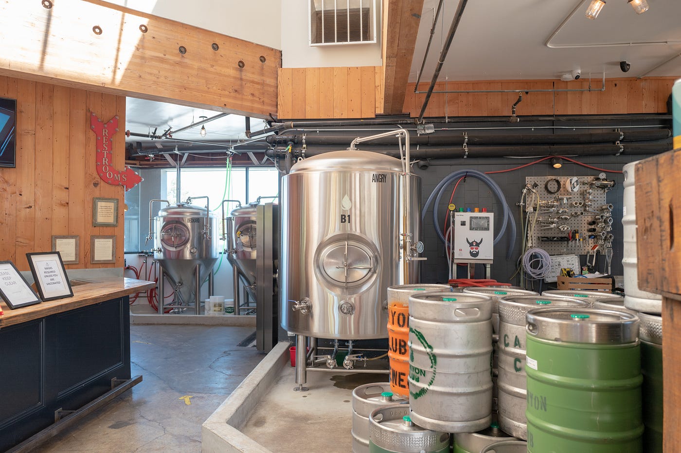 Brewing is front and center at Canyon Club and is treated almost like a performance. While many brewpubs hide their brewing equipment away behind big glass walls — perhaps illuminated with some color-changing LEDs — Canyon Club brings its pumps and hoses right out onto the restaurant floor. As you walk into the restaurant, you pass by a giant, open area filled with gleaming tanks, stacks of waiting kegs, and pegboards holding an assortment of brewing tools, with only a foot-tall concrete lip separating you from the future beer you may soon drink.