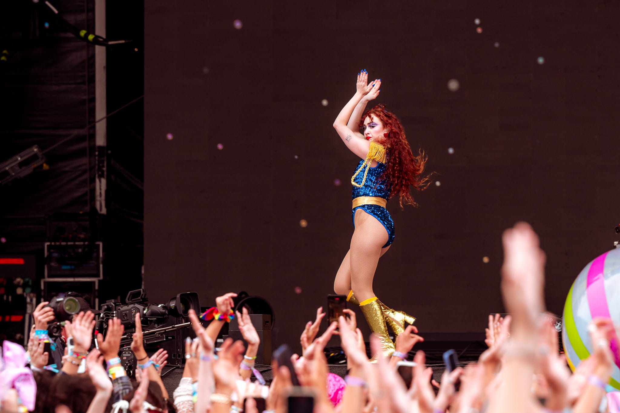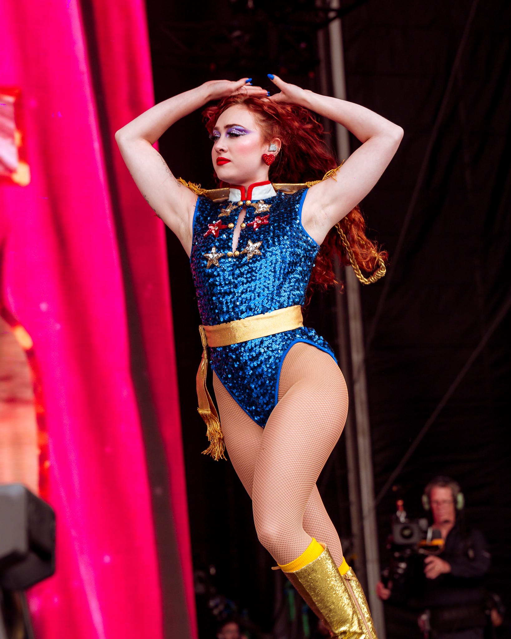 Finally, it was time, “Greetings from Chappell Land” splashed across the back screen and the mid-west princess came out on stage, her band and herself wearing their 80s camp and marching band blue and yellow show outfits. She opened with her trending hit Femininomenon to which the crowd knew every word. Chappell runs, dances, and belts every note effortlessly — except for when she is breathing heavily between songs and taking copious sips from a pink thermos. The high energy starts with her and she is incredibly engaging with her audience, always taking the time to teach the Hot To Go dance despite the speed of her growing fame.