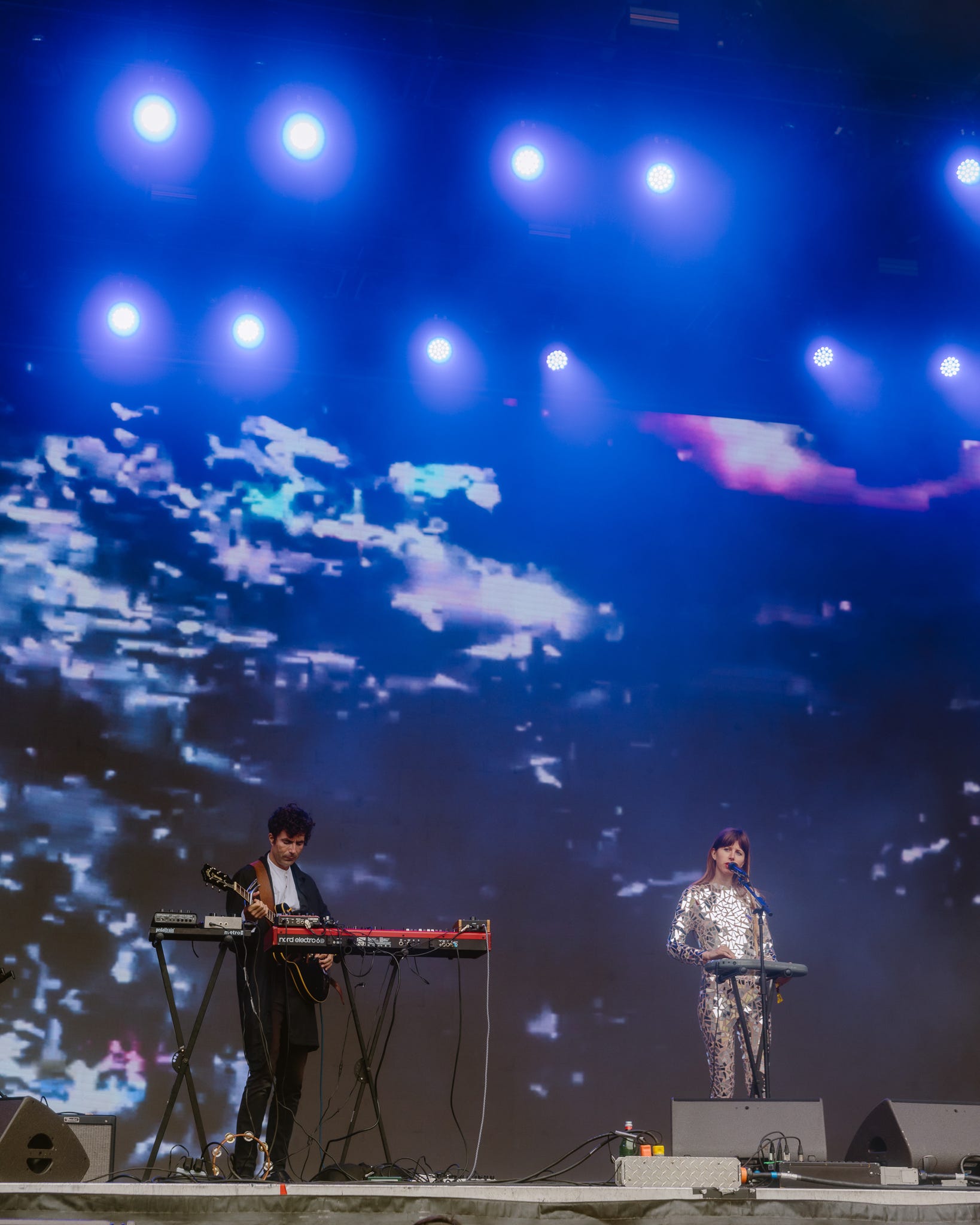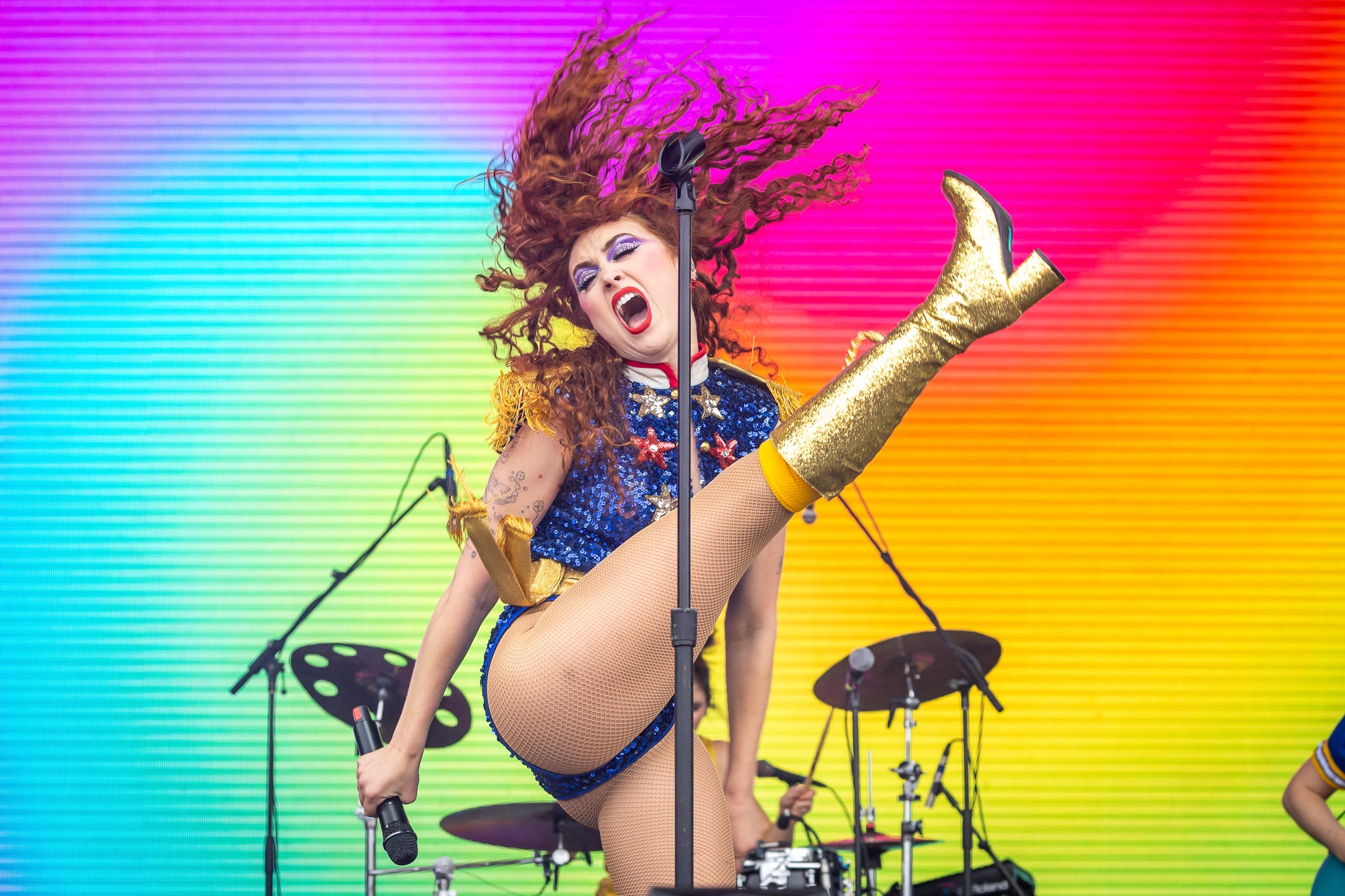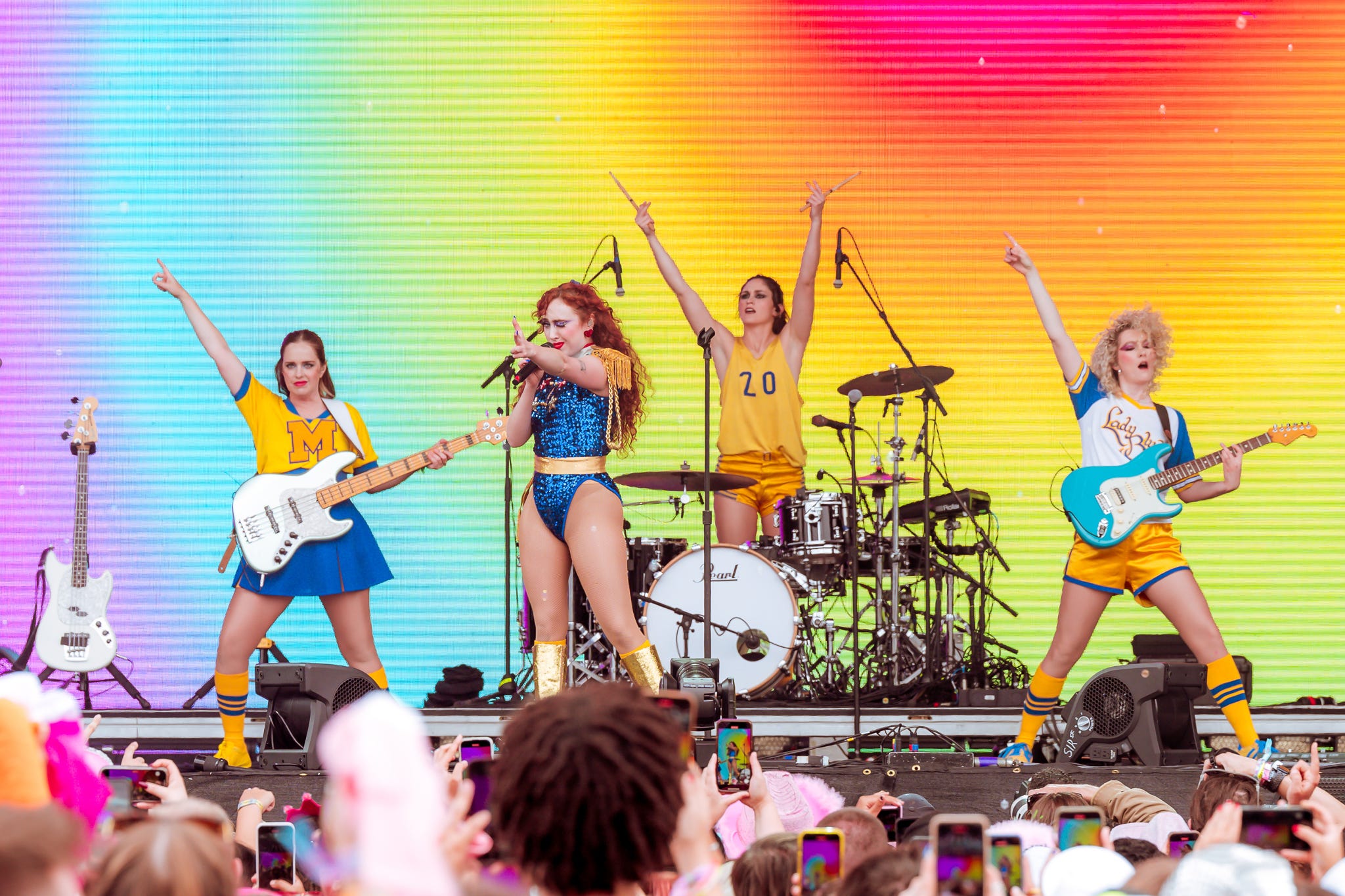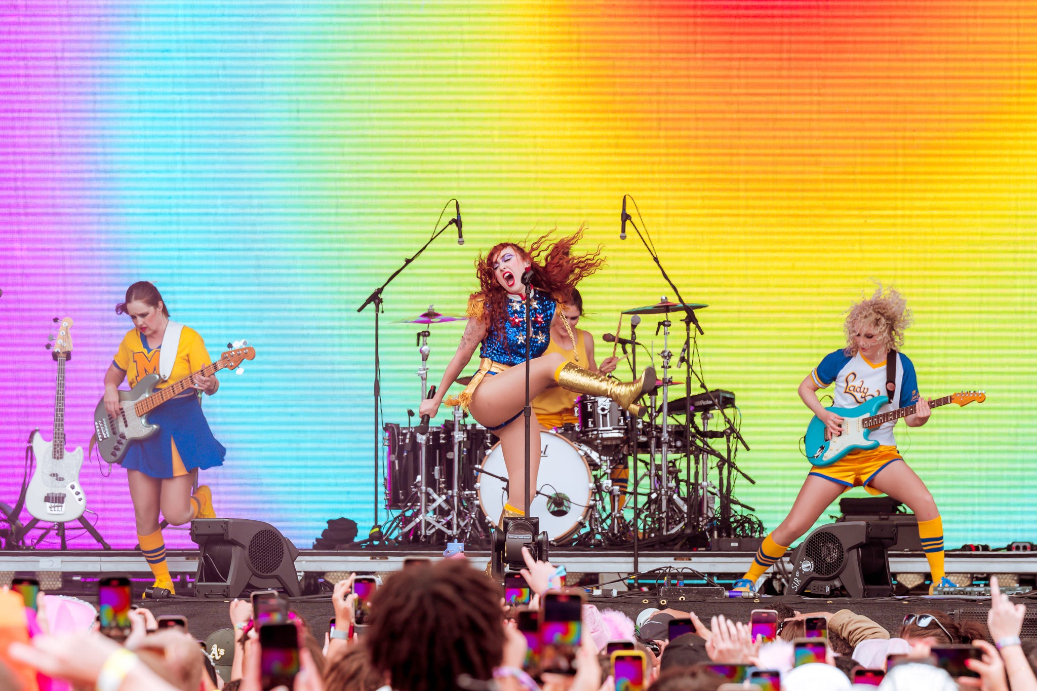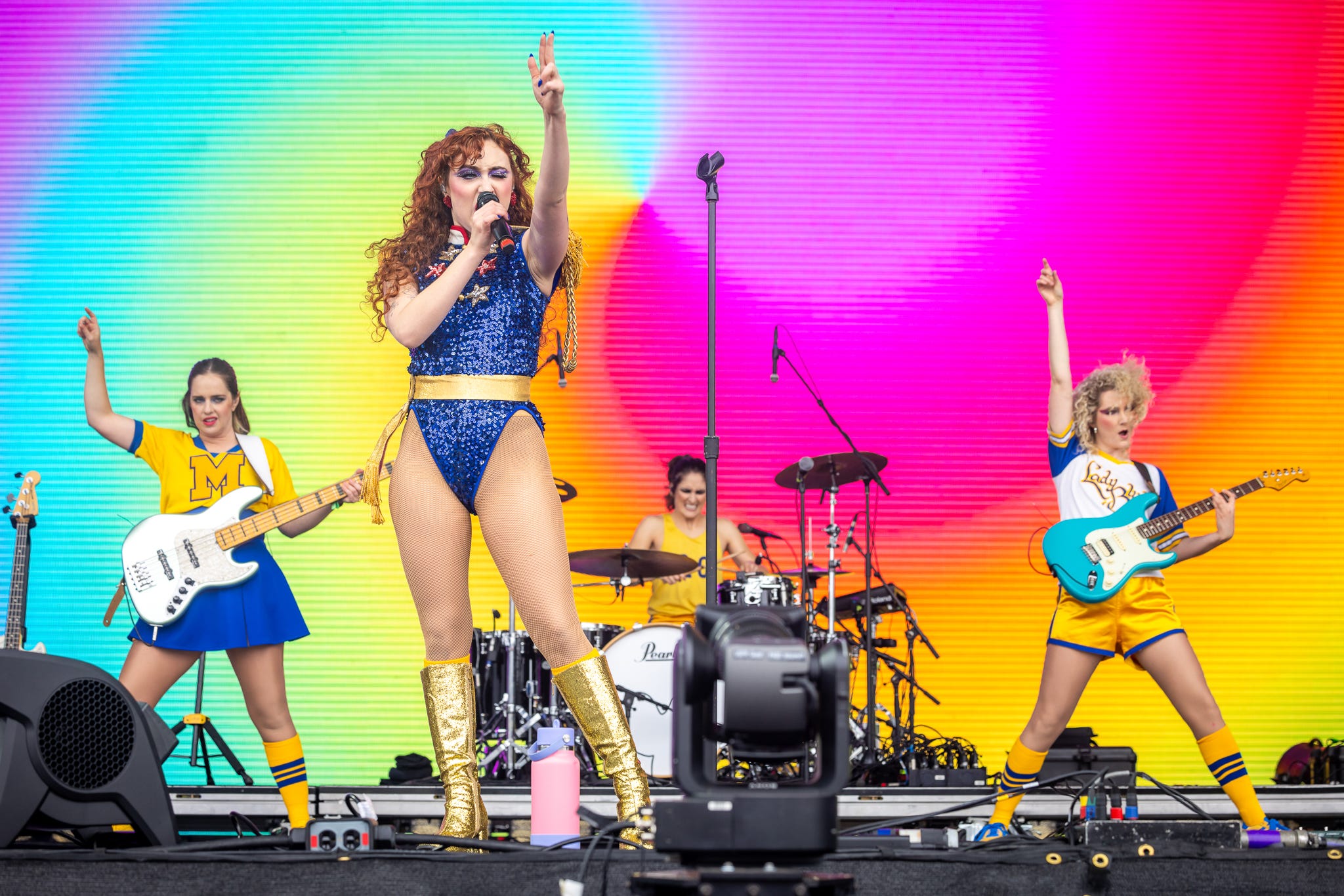Finally, it was time, “Greetings from Chappell Land” splashed across the back screen and the mid-west princess came out on stage, her band and herself wearing their 80s camp and marching band blue and yellow show outfits. She opened with her trending hit Femininomenon to which the crowd knew every word. Chappell runs, dances, and belts every note effortlessly — except for when she is breathing heavily between songs and taking copious sips from a pink thermos. The high energy starts with her and she is incredibly engaging with her audience, always taking the time to teach the Hot To Go dance despite the speed of her growing fame.