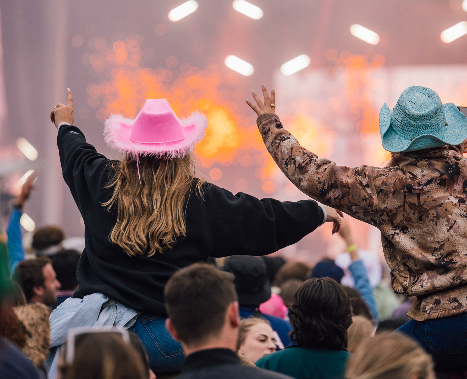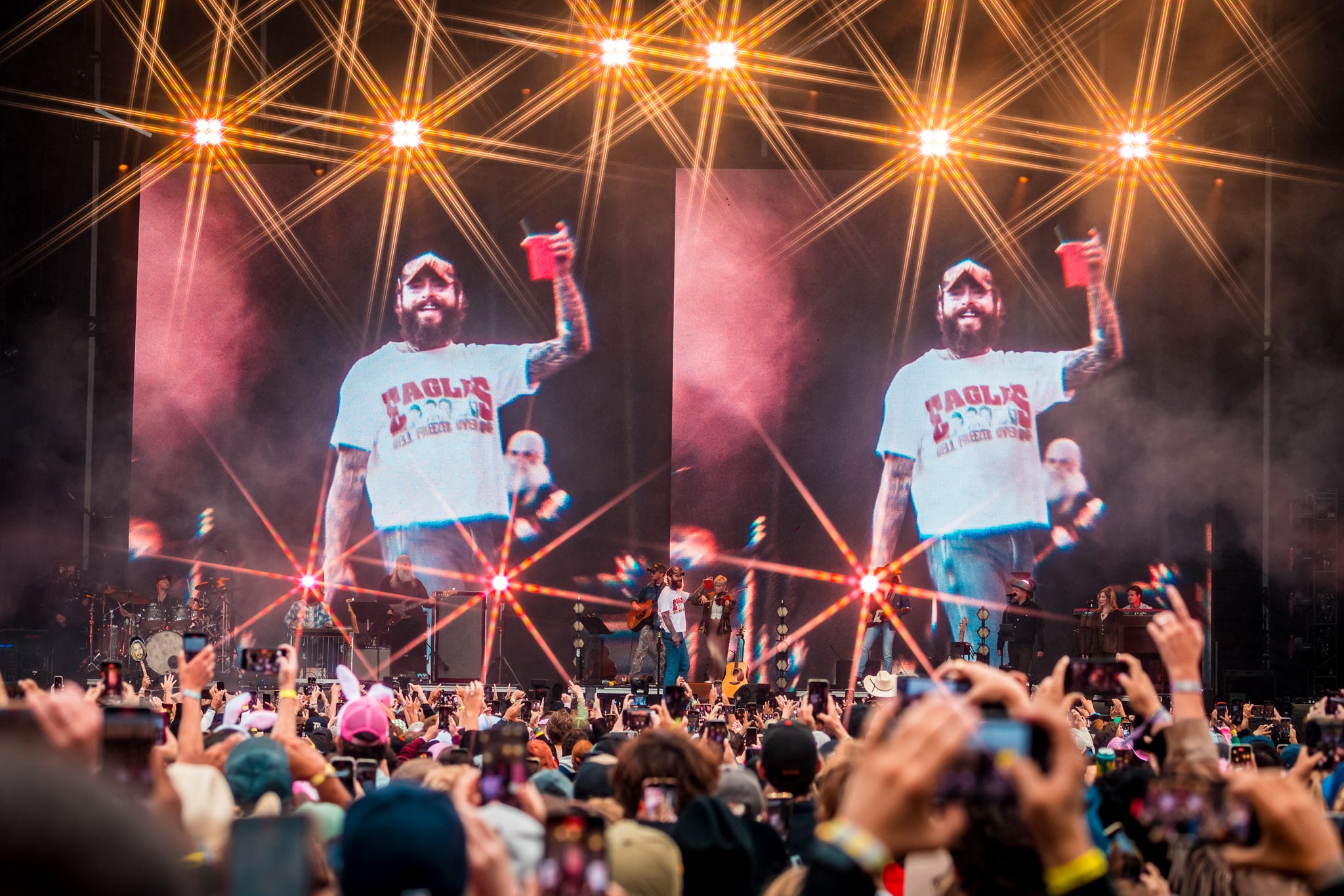 He felt a bit like a sacrificial lamb to a sea of pink cowboy hats but at least he got to perform for a big crowd. For that entire hour, the wave of people did not stop once around us, every attendant in the park was coming to the main stage. The wait was intense. Before start time we were treated to a little preshow in which Chappell rode around the perimeter of the polo field on the back of a golf cart, proceeded by a small marching band and some ribbon twirlers. We speculated whether that was Roan or a double in Roan drag.
