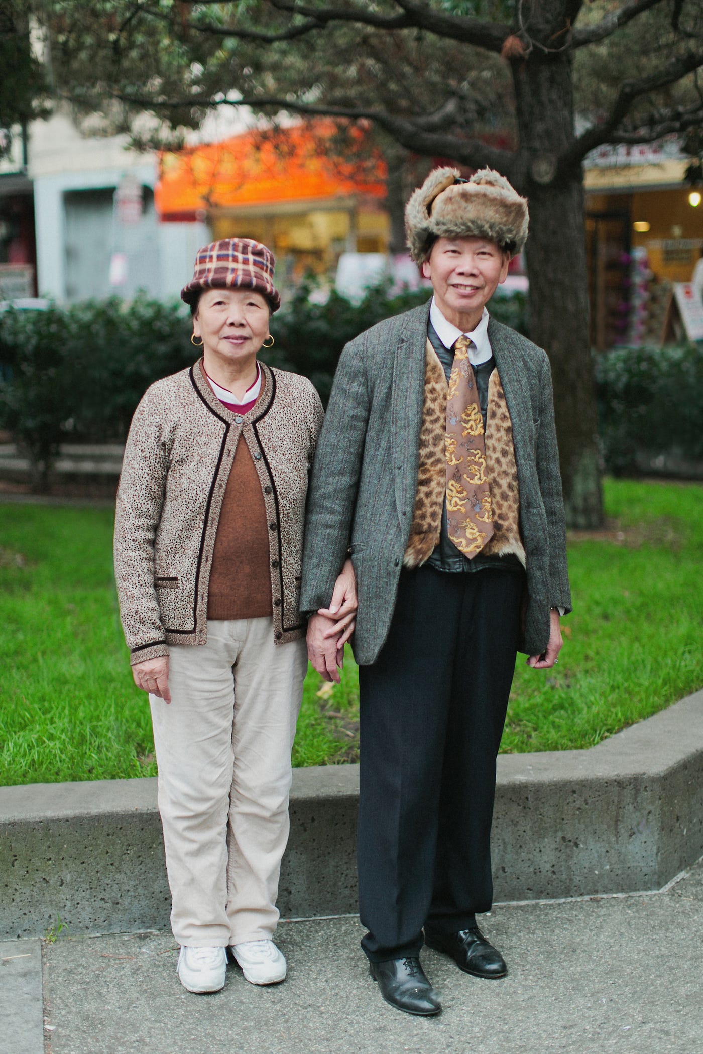 We saw them at Portsmouth Square and frantically made a beeline for them. The were both in a brown, earthy palette, with matching cheetah sweaters and furry hats. He didn’t want to pose for us or reveal his name, but thanks to the persistence of Kat, our translator, she bantered with them long enough for them to agree to a portrait.