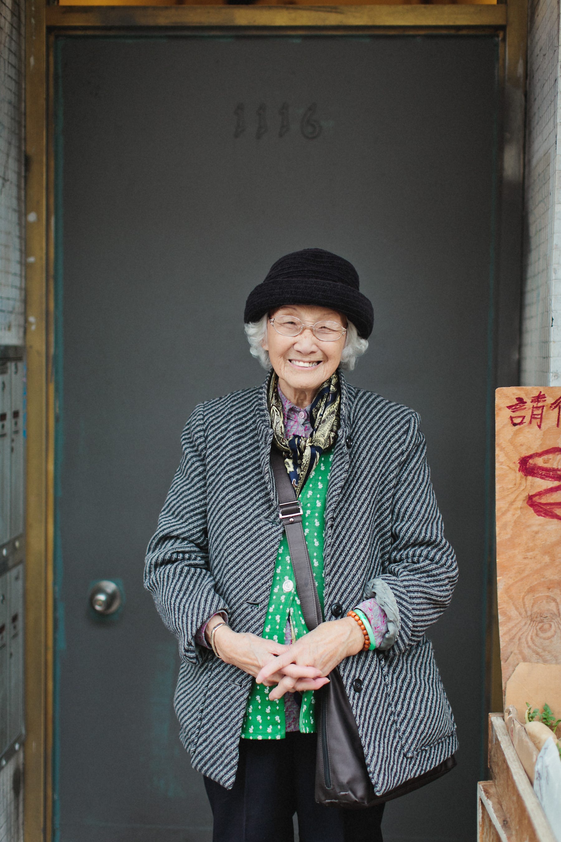 We cornered Yok Chung, a 90-year-old Chinatown resident, outside a grocery store on Stockton Street. She was a bit taken aback at first by the three of us, a gaggle of girls touching her tweed coat and complimenting her on her layers of silk—a jade blouse with a purple paisley shirt underneath and a black-and-gold paisley scarf around her neck.