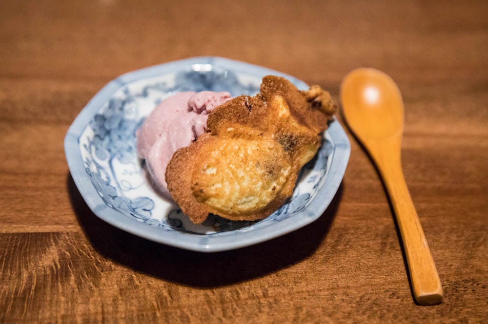 One of my longtime Japanese desserts, taiyaki—which I usually get at Kissako Tea in Japantown Mall — arrived to finish, a little, fish-shaped pancake/waffle shaped, filled with Nutella over housemade huckleberry ice cream. Future seasonal flavor combos are endless (they previously made hōjicha tea ice cream).