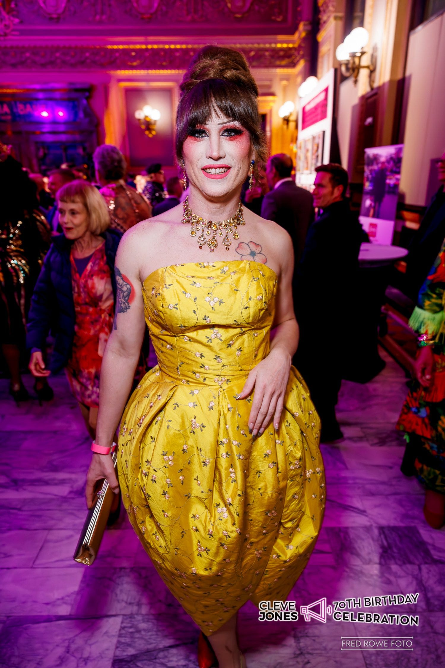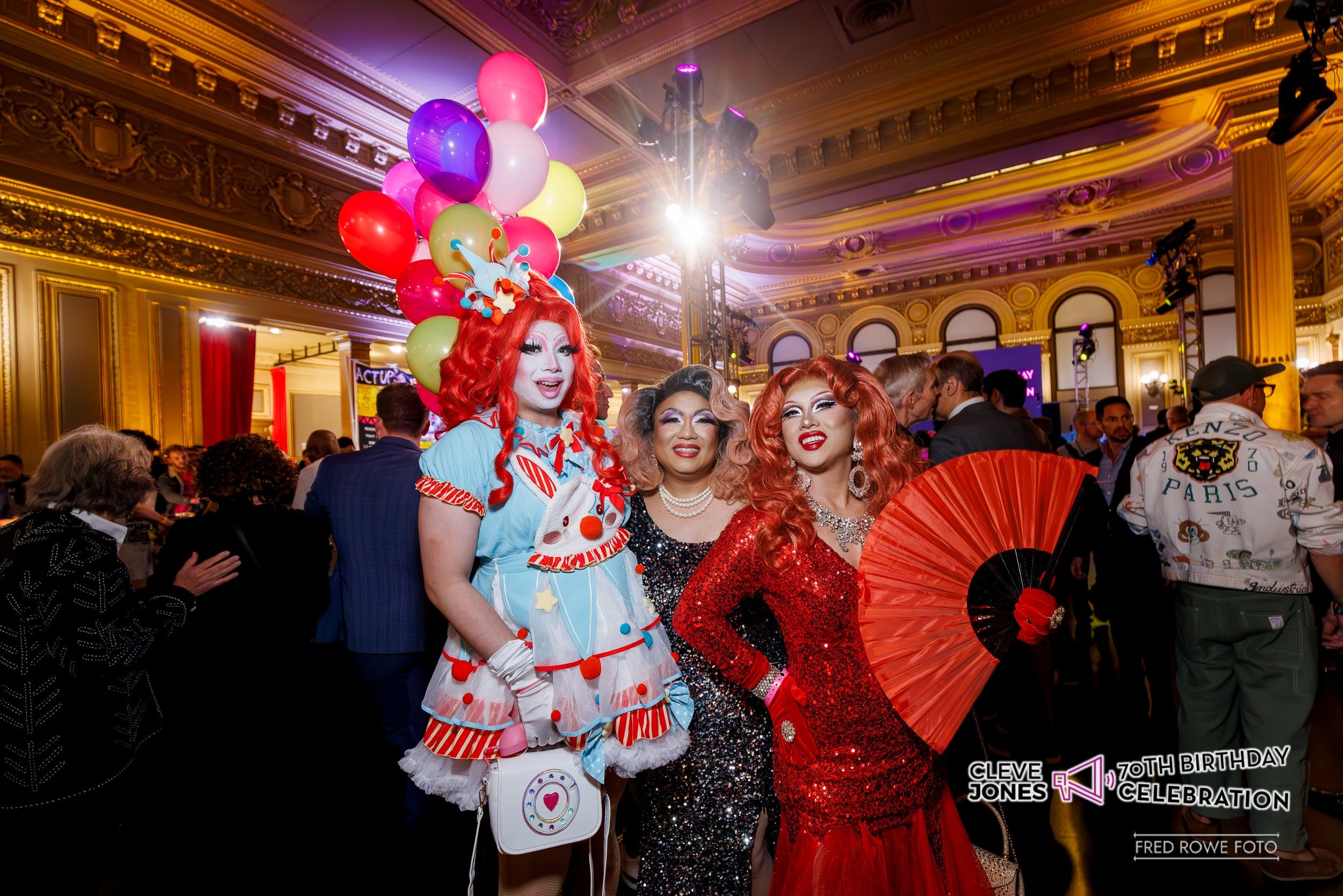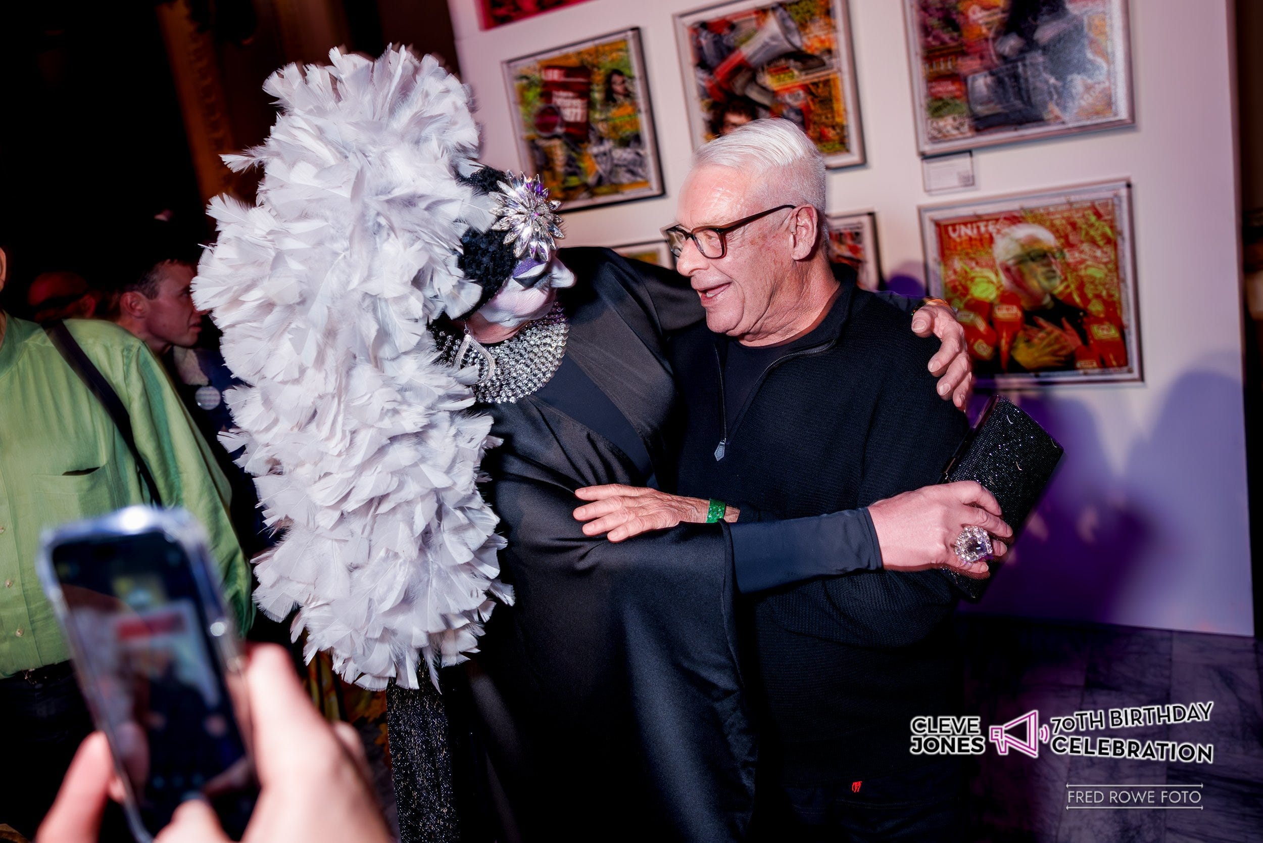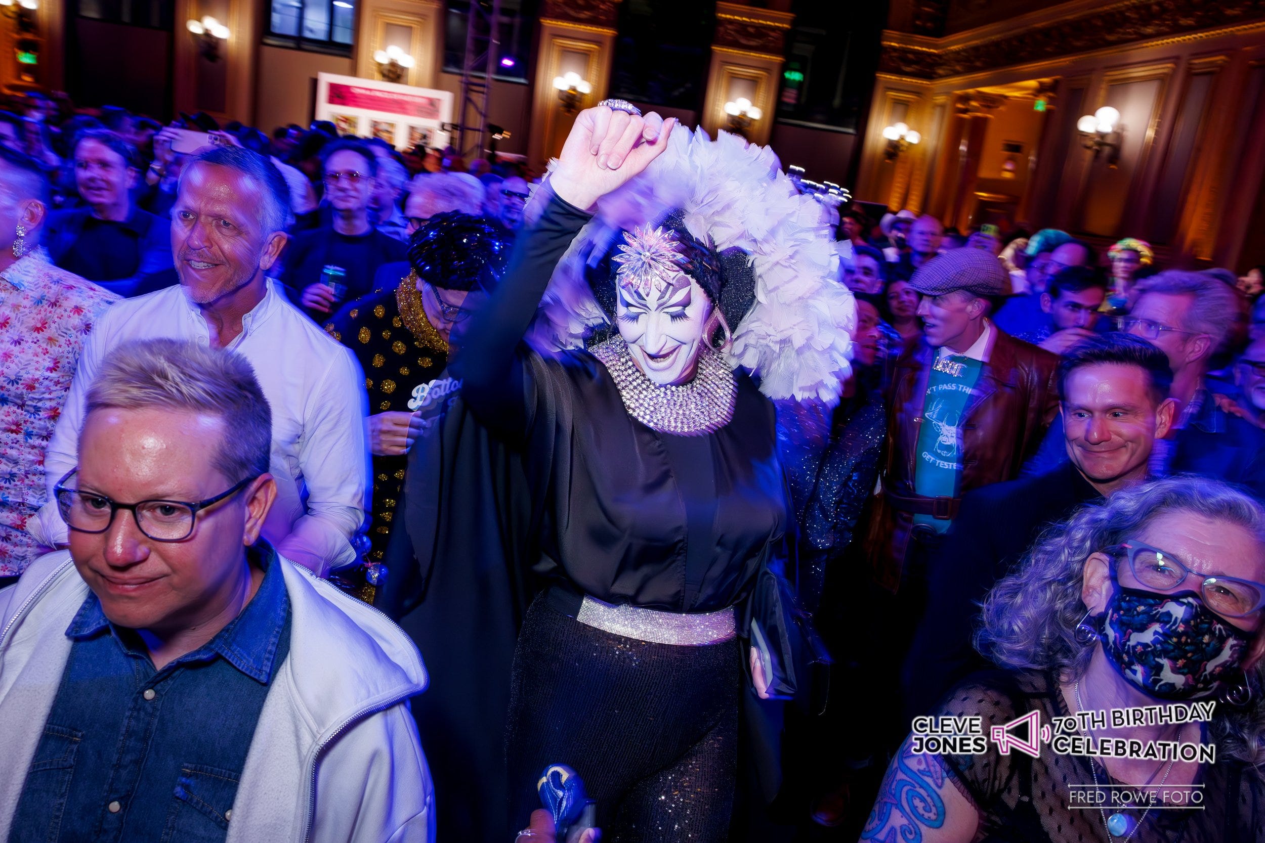 The glitzy night at Hibernia Bank was billed as a party, but many times it felt more to me like a public television special that showcased local LGBTQ+ community leaders. Cleve kept his promise to keep speeches to a minimum, but in their place we saw throngs of drag queens, leather daddies, choir members and activists march to the stage to take a bow and pose for a photo. The successive appearance of each group, one after the other from the AIDS Quilt, Gay Men’s Chorus and Comfort & Joy was an effective display of all that Jones has touched.