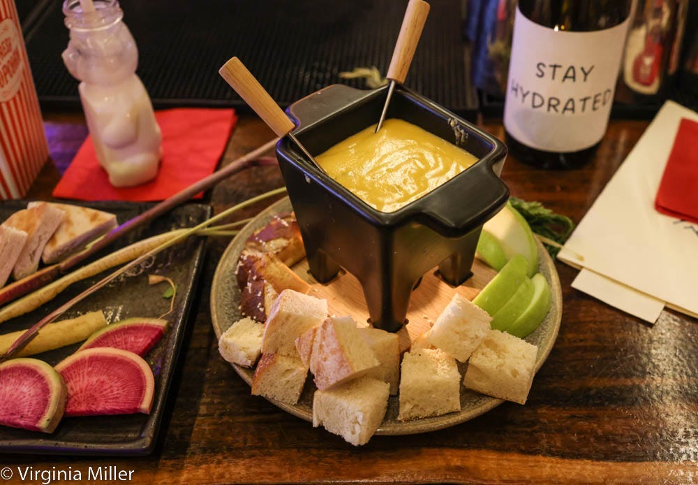 I can’t resist Swiss cheddar fondue with French and pretzel breads plus green apples to dip in. Rounding out cheeky food offerings, my friend and I enjoyed Swedish meatballs with lingonberry sauce served on a sword and childhood-reminiscent bacon-wrapped cocktail wieners in BBQ sauce, tributing the ubiquitous Tijuana-style bacon-wrapped hotdogs you find late night via street carts in SF’s Mission District or post-Giants games.