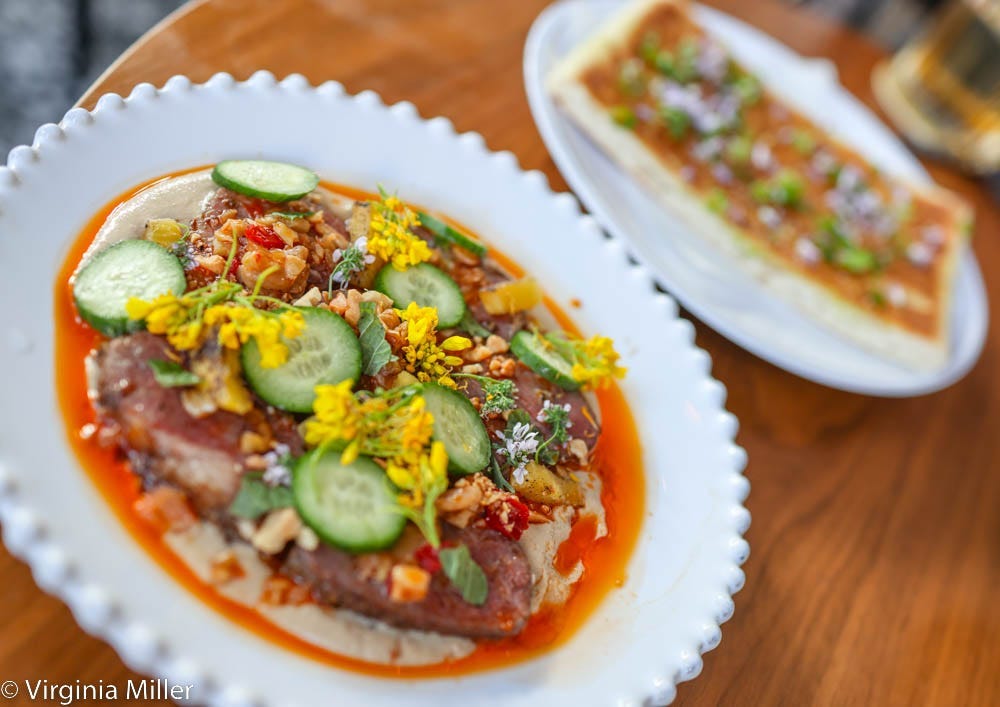 New food delights are many. I historically loved their crudo and still do. Currently, yellowfin tuna crudo is vividly spicy in passionfruit leche di tigre and aji rojo pepper sauce, brightly contrasted with Meyer lemon aioli. I can’t resist a smoked trout dip. Madrigal’s version features our best-in-the-world NorCal Mt. Lassen trout, herbed mascarpone and sweet pickled chilies scooped up with Ritz crackers. It tastes like childhood.
