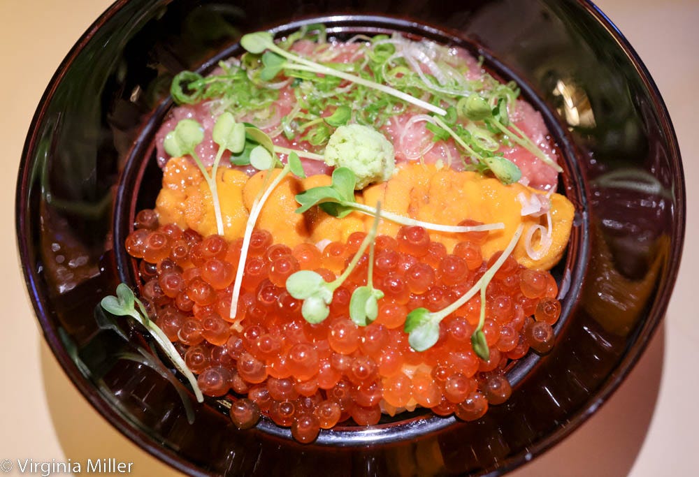 But the experience was uneven — including the sake somm attending only to the bar guests vs. initially coming to the two tables to tell us about seasonal, off-menu sake selections and info we would have wanted before deliberating our pours for the meal — and an uneven food. While I appreciate having the rare Akita Prefecture snack of iburigakko (smoked pickled daikon) with cream cheese, the cream cheese was hard and tough to scoop up, while nori tempura chips were “one note.” We wearied of both after a couple bites. The chef’s choice sashimi platter was standard, but there are dozens better in town. Sauteed mushrooms in butter soy were fine, while the stronger veggie option was an eggplant special. Raw Hokkaido scallops dotted with lava salt, uni sauce and salmon roe, or a mini-kaisen don rice bowl topped with my beloved bafun uni, ikura roe and tuna toro were better dishes, if standard.