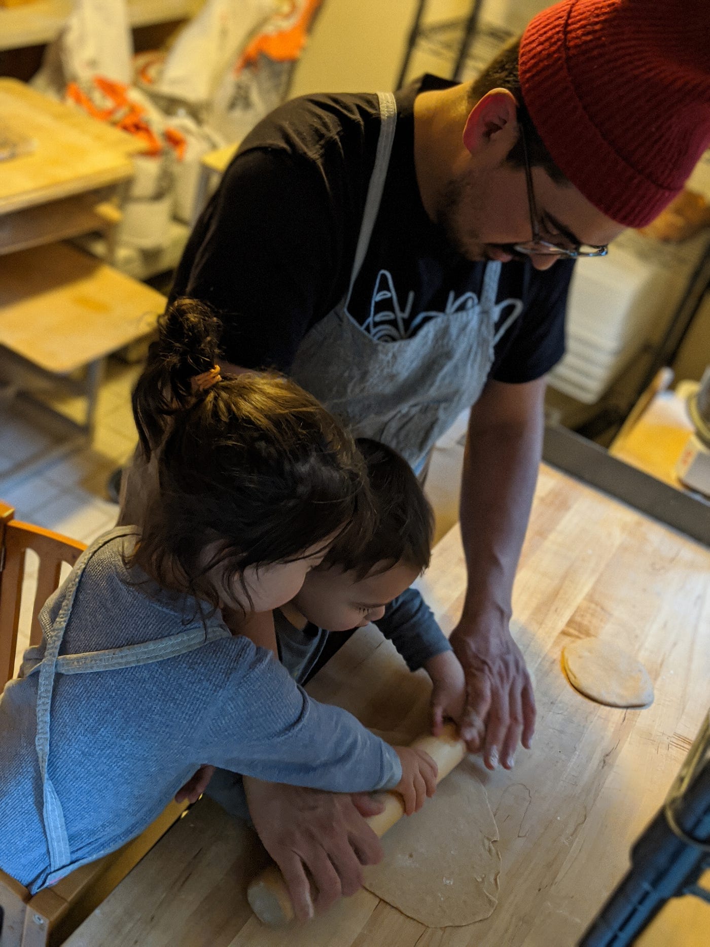My partner is working full-time during the week, so I am very consumed by entertaining/exercising/feeding/keeping on an even keel our two children, 1.8 years and 4.5 years old — the minute-by-minute responsibility of these two keeps me from thinking too far beyond the immediate moment, which is tiring and a good way to avoid too much worrying. Baking for my neighbors has provided a lot of comfort and focus. If you live in the area, you can order bread from Oakland Bread Studio here.