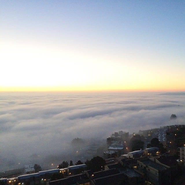 If you live in the Bay Area and looked at your Instagram and/or Facebook feed this morning you probably noticed a bunch of photos of people freaking out (with joy or dismay) at the appearance of the fog. Some of the photos are quite dramatic and haunting, especially where it looks like the surroundings are being engulfed by Karl. Here are a few foggy pics from around the Bay that caught my eye: