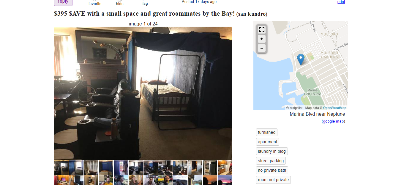 This space for rent in San Leandro offers a tiny 5-by-9.5-foot area within the living room equipped with a twin-size bed, a clothes rack, and swathed with curtains for “privacy.” The entire apartment is shared by six female roommates. This unfortunate situation does come in cheap at $395 a month, as it should. The setbacks (other than that you’re sleeping in the living room): You’re discouraged from cooking, and if you have items to store, you’re gonna have to take your items elsewhere and pay for a separate storage unit. Bonus, though (not really): If you want to get a rent discount you can do “light daily house cleaning (mostly in the bathrooms).” The poster says they’re willing to pay $5 for 15 minutes each day plus $20 for one hour once each weekend. That means you’re blessed with an optional rent reduction of up to $200/month possible (10 hours total).