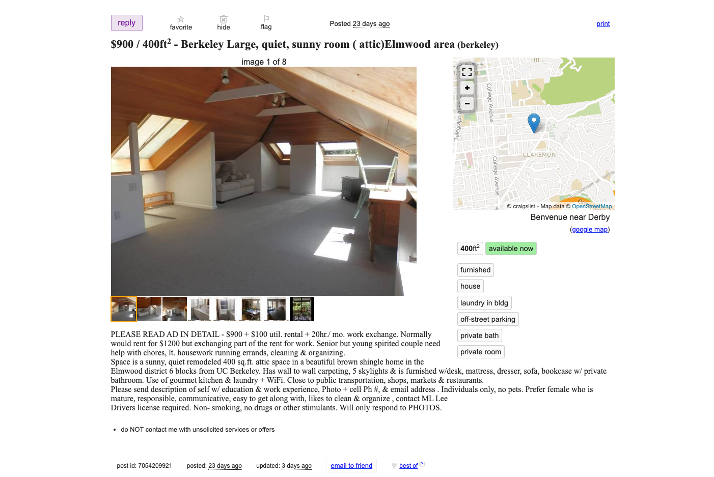This type of rental pops up occasionally, and the legality of it is still a gray area. This 400 square foot attic room in Berkeley advertises for $1,000 a month including utilities. The ad says that the rent for this room is typically $1,200 but the couple listing this rental (and who you’ll share the home with) want someone to do 20 hours of “housework, running errands, cleaning & organizing,” in exchange for $200 off the monthly rent. The room comes semi-furnished with a private bathroom and access to the kitchen and laundry. The specifics of the housework are not listed.