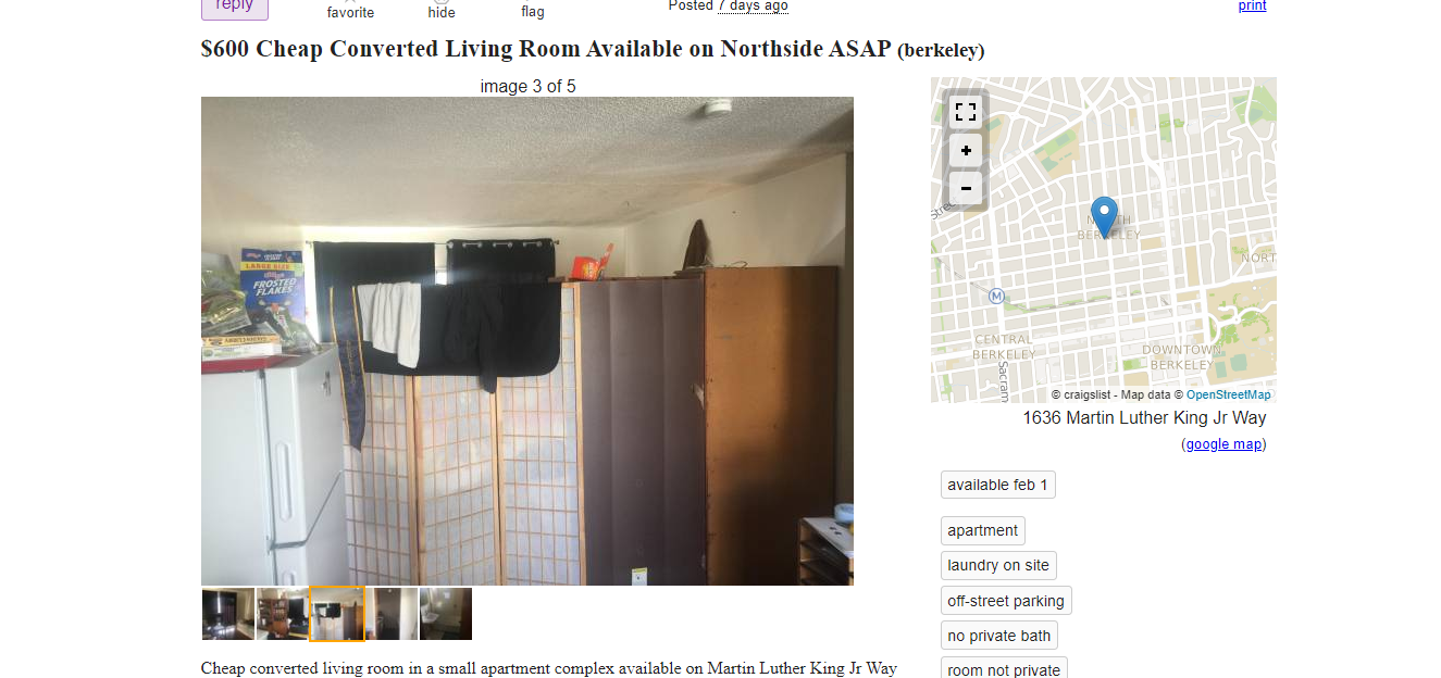 Back in the pre-tech boom days, you could find an actual studio with a full kitchen for $600 in Oakland. Today, you might randomly come across a “converted” living or dining room for this price. This converted space in Berkeley next to the kitchen gives you: a bookshelf, curtains, and a twin-size bed for $600, in addition to the cost of internet and utilities.