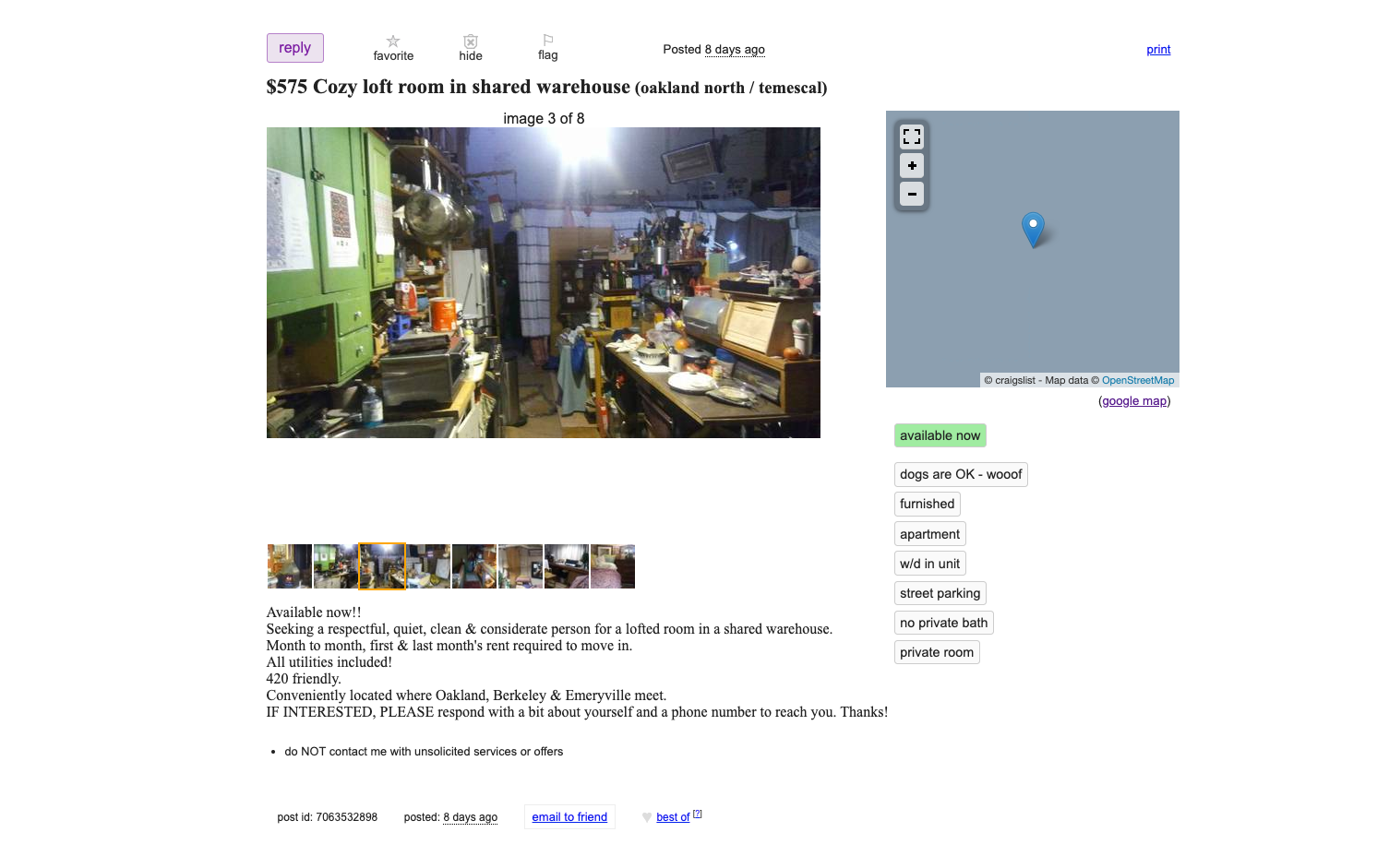 This space up for grabs somewhere in North Oakland doesn’t specify how many people you’ll be sharing the warehouse with. At $575 a month, you don’t have to worry about utilities — but given the look of the kitchen, you might have a hard time doing any cooking considering how jam-packed it is with an abundance of dishes, pots, pans, and pantry items overflowing on the counters. While we can’t speak to the safety of this particular warehouse, it may also be best to consider the safety of rentals like this — the painful memories of the Ghost Ship warehouse fire that took the lives of 36 people in December of 2016 is still fresh in people’s minds. While a lot of renters are struggling to find affordable places to live, a crowded warehouse space is questionable.