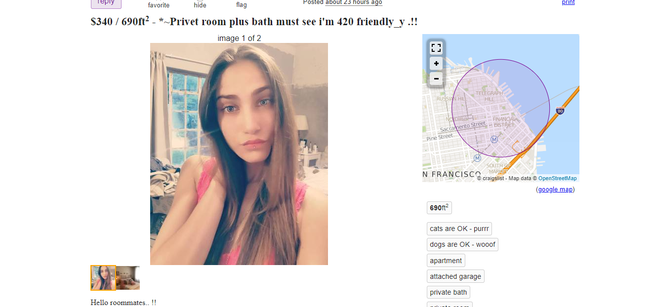 You know the listings that seem just too good to be true or off in some way? Chances are, they are. This one lists a room for rent for under $400. The listing shows a generic photo of a bedroom along with selfies of a beautiful woman, who definitely does not live at this fake place. The post says that the room comes furnished, with a private bath, and utilities included. The ad asks that you visit: roomiesafety.com or roomie48.info. The websites listed take you to roomster.com where you can “login” with one of your social media profiles. (We didn’t do it, because we’re not idiots.) Have you heard about these websites? Let us know!