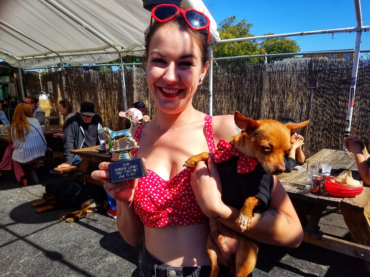 The third-place winner, Peanut Awesome, had a particularly warm and fuzzy moment. “I found him on the streets of Oakland in a dog gang,” his owner, Bridget, told me. “We guess that he’s seven years old, but we really don’t know.” We do know that he’s lived with Bridget for five years now and that he is happiest when she is cuddling with him.