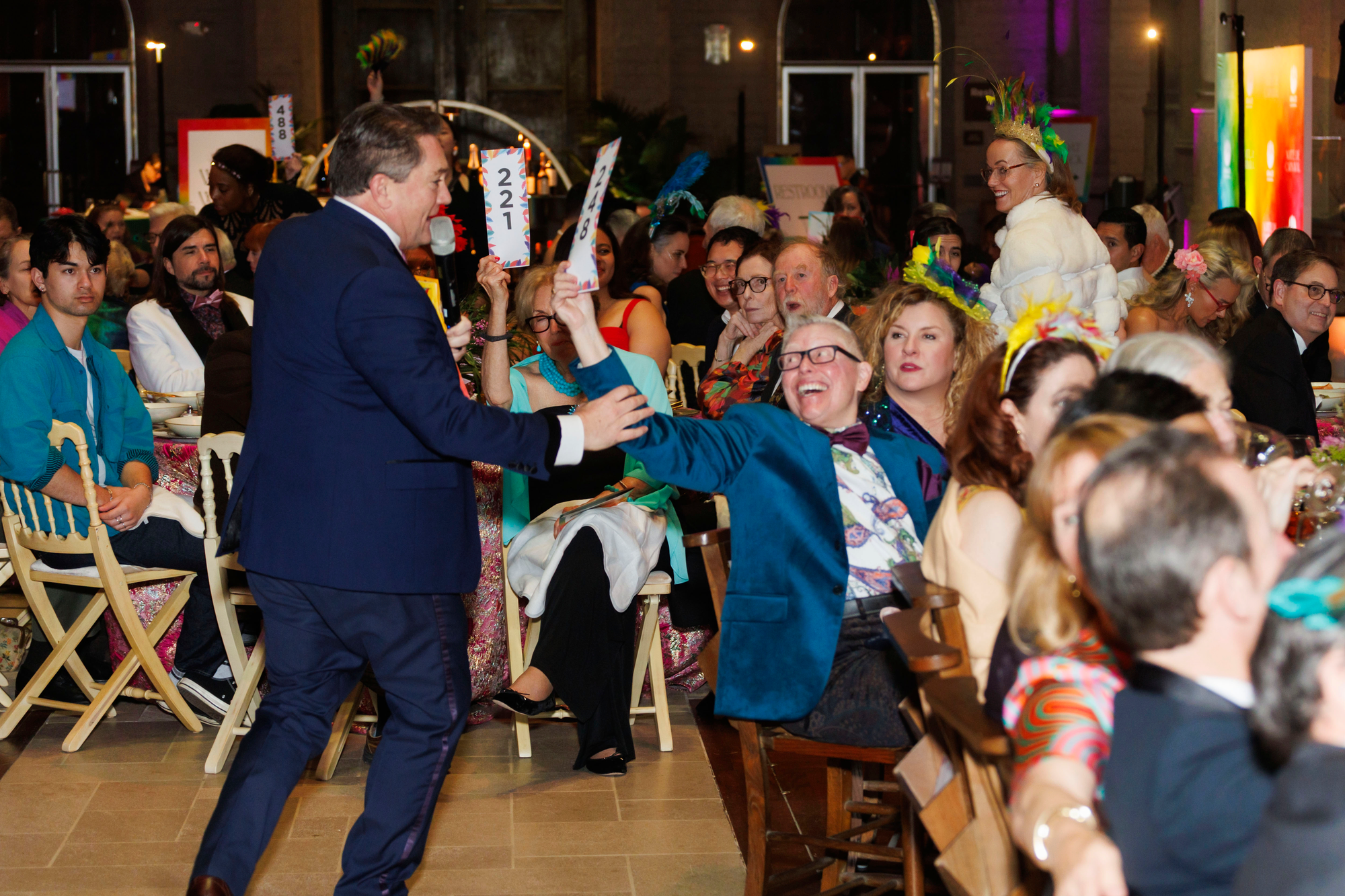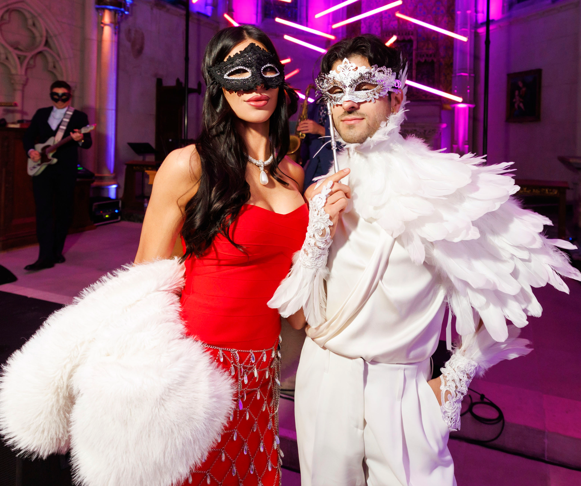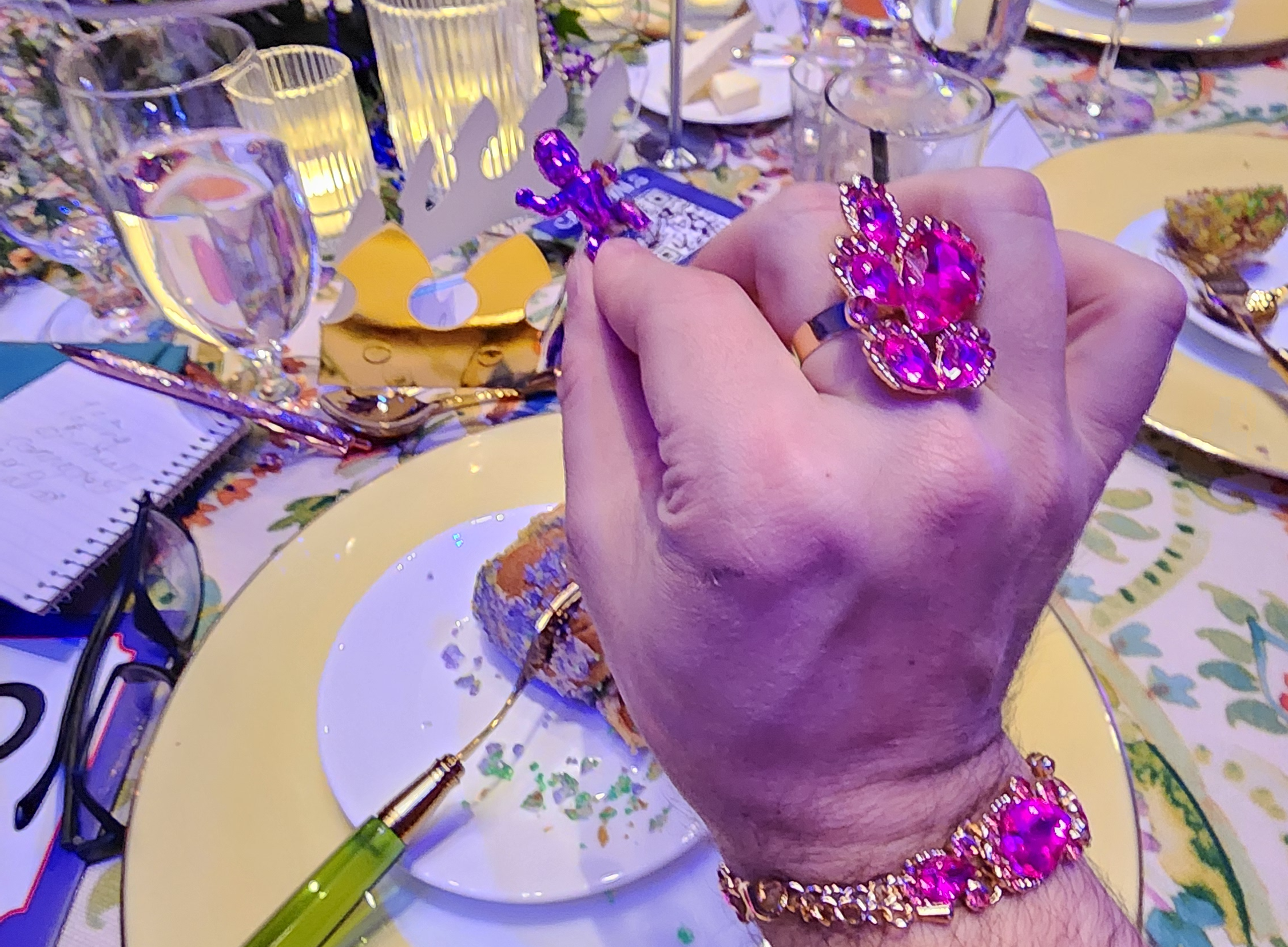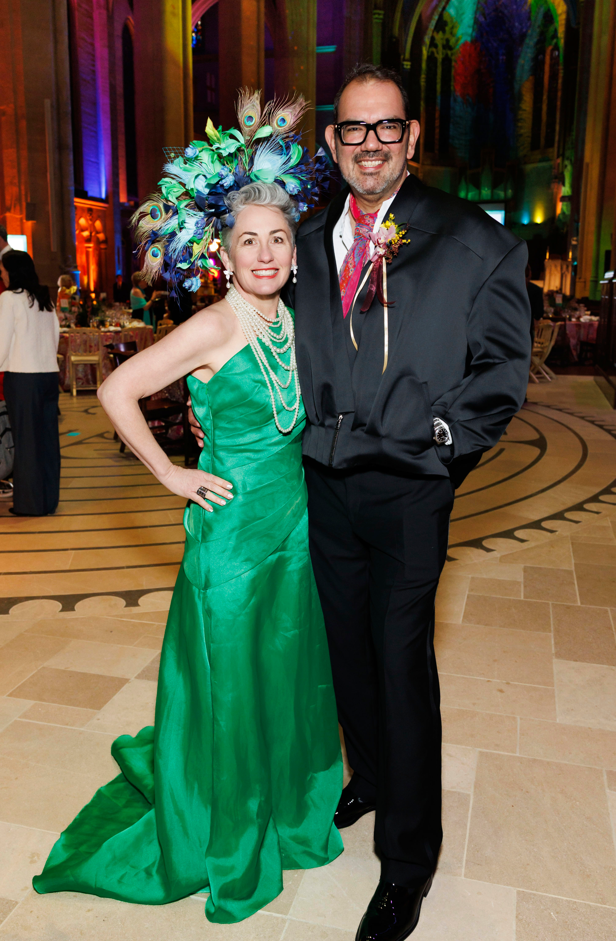 Erin, a co-chair for the night, brought out a knockout green peacock-feathered fascinator straight out of the Kentucky Derby, paired with serious layers of pearls. A true maximalist Carnivale moment against Robert's sharp tuxedo.