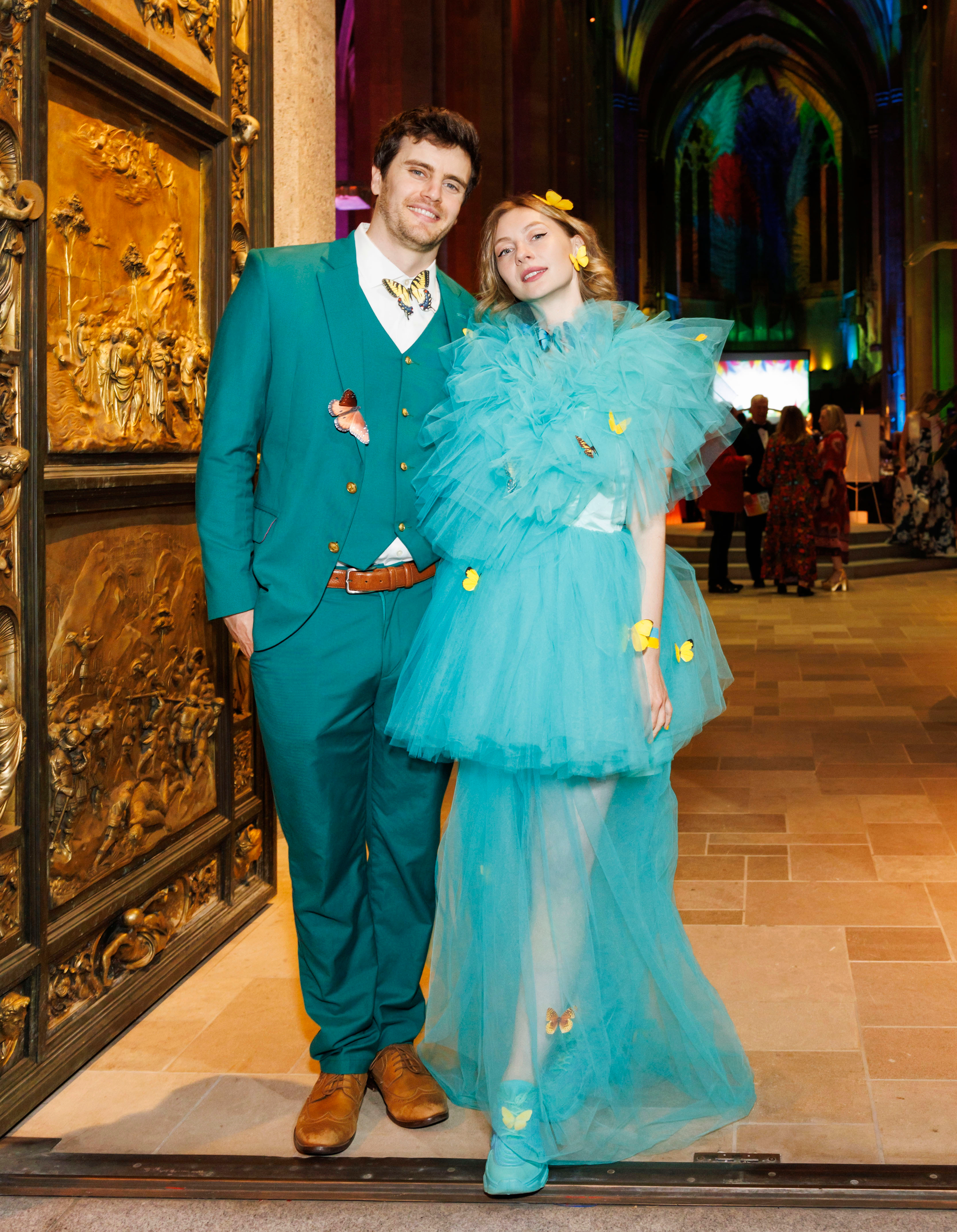 Her mom made this architectural spring tulle dress, and Kate finished it with her own custom-made butterfly necklace and appliqués. Johnny matched the energy perfectly in a green suit with a butterfly bow tie he likewise had decorated.