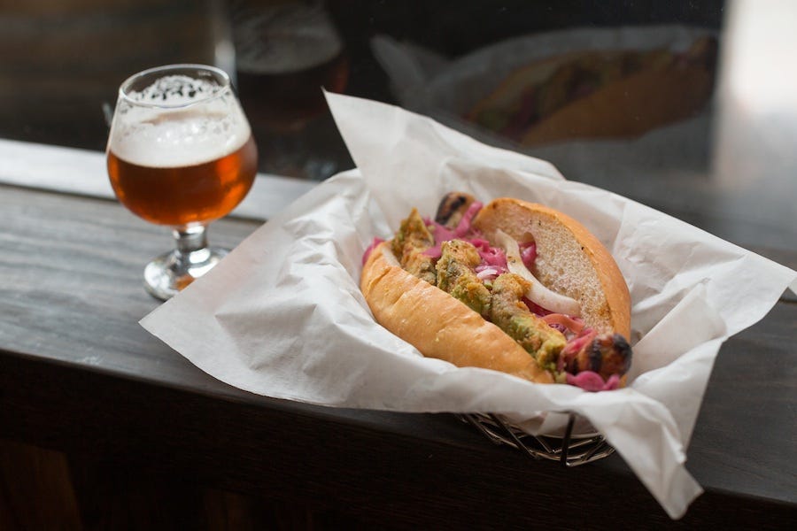 I don’t know about you, but a rockin’ yet intimate beer hall is pretty much my idea of a good time. Especially when it’s paired with unique food like this kick-ass “Burnin’ Bird” sausage with chicken habanero sausage, harissa aioli, fried avocado, and fennel apple slaw. Yes please: