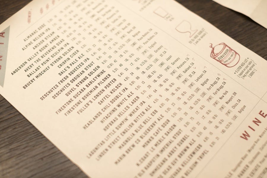 There’s bar seating, a few more intimate tables, and five large communal beer hall style tables in the main room. “This is our take on a modern California beer bar,” Rothman says. “But we love the fun and feel that a traditional German beer hall has too.” They’ve certainly captured both of those elements, as it feels like a very modern mini beer hall.