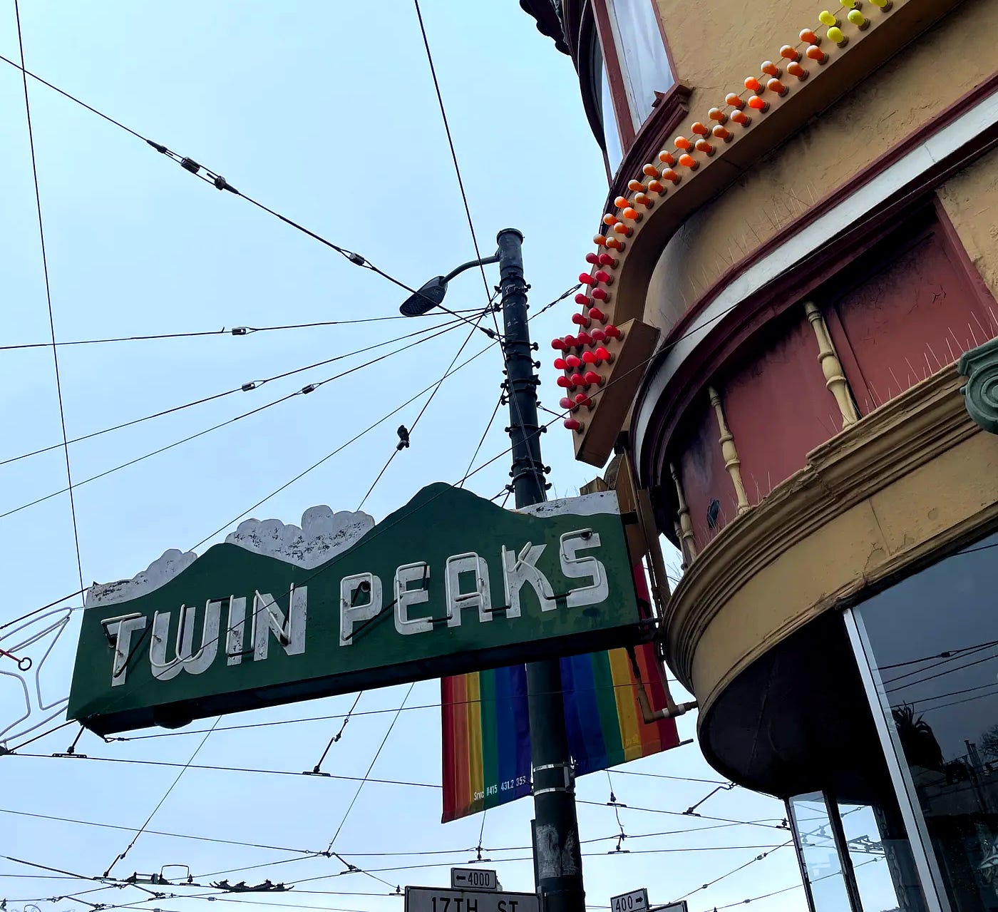 Above the stained-glass light fixtures that dangle so iconically from the high ceiling there is an upper floor at Twin Peaks Tavern, with an ATM and a small bathroom, where you can sit at round two-seat tables and gaze over all the bar’s action from above, including the bartender in front of the ornately carved wood and gorgeous mirrors of the back bar, possibly in the throes of putting together an Irish coffee or two. And you might notice that they’re using Bushmills as their whiskey, and that the coffee pot’s on a warmer almost hidden next to all the liquor bottles, and that there’s a blender there too, somehow squeezed between it all, and that its whir is barely discernible above the din of the clientele, as this place fills up early and maintains its convivial crowd until closing time most nights.