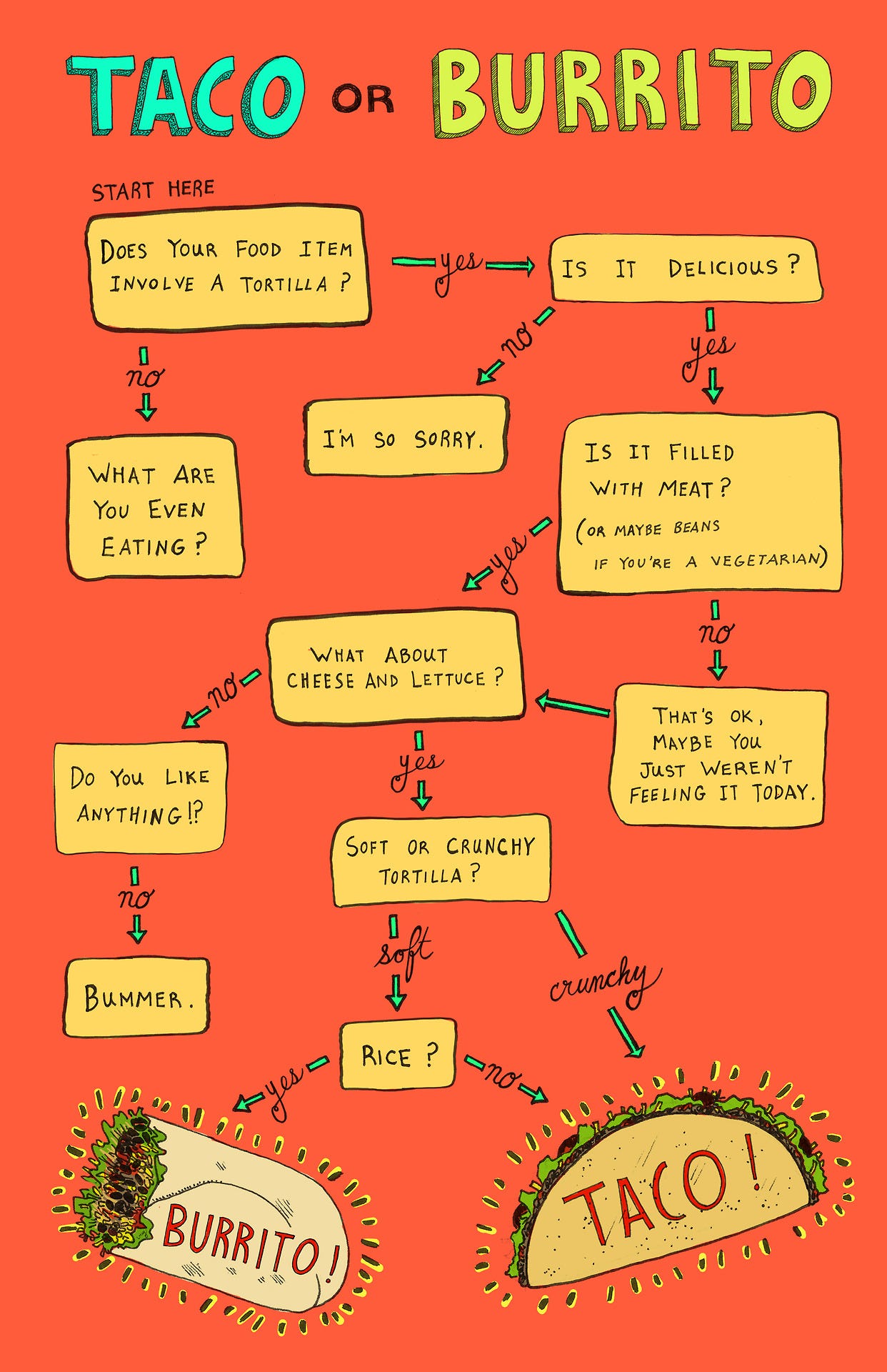 Artist Lauren May illustrated this awesome flowchart with one of life’s more important questions: taco or burrito?