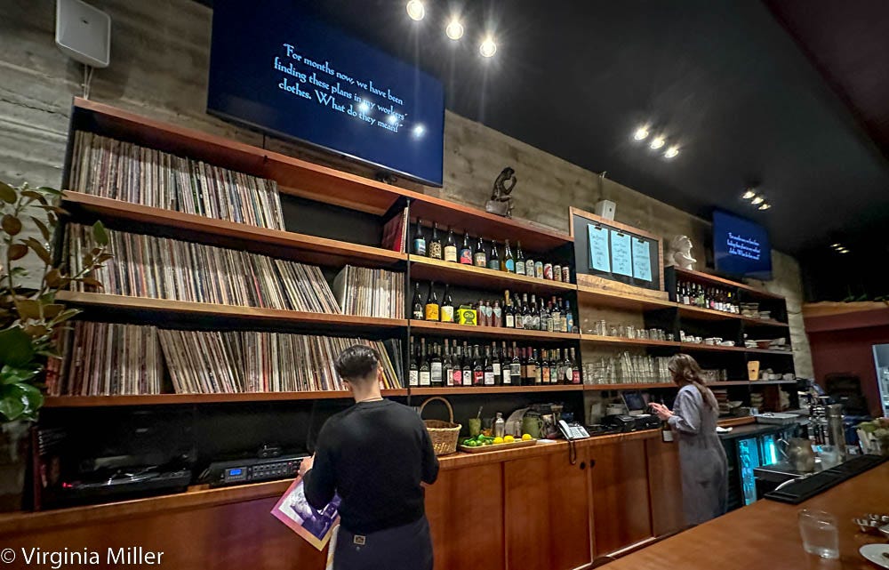 At night the space warms up with old movies on two flat screens (Fritz Lang’s legendary 1927 “Metropolis” on one visit, a 1950s sci-fi movie another) and vinyl alternating between two record players (we wove from local alt to the great 1960s Walker Brothers my first visit, a David Crosby tribute from the Byrds to solo Crosby work the night after her died). Staff seem happy to be there and bring good cheer, particularly sitting at the bar.
