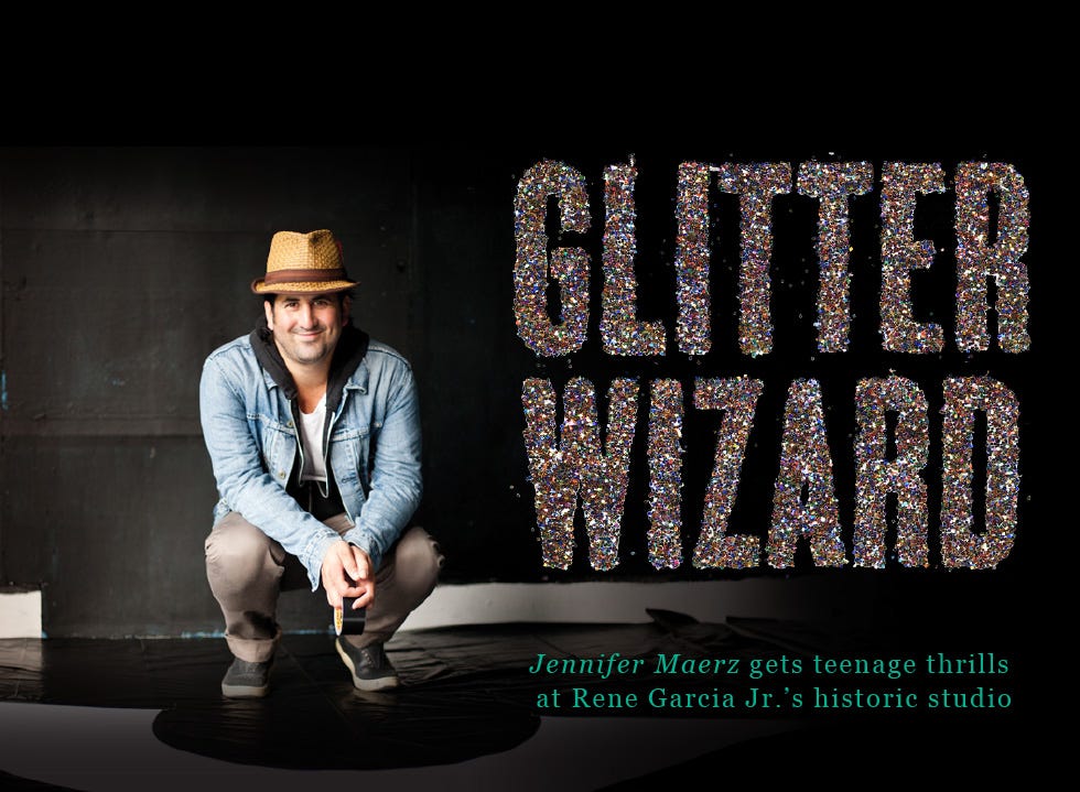 I was fortunate to start collecting Rene’s artwork early. For the past 10 years, he’s had a steady stream of commissions from people all over the West Coast — at the rate of one to two new requests a month. Although he works in whatever medium he can get his hands on — wood, sand, photography, T-shirt design, screen printing, a latch-hook rug of a mushroom cloud explosion — 90 percent of his contacts want one of his glamorous glitter paintings. Using Elmer’s Glue and old-fashioned glitter shakers, he crafts giant, dynamic portraits of strong, sexy babes as well as the random dazzling celebrity or sports hero, reimagining his subjects with Warholian flair.
