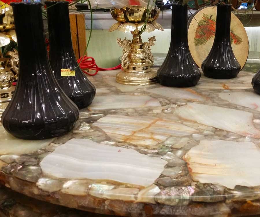 Alabaster and abalone shell resin tabletops and a selection of folding table bases