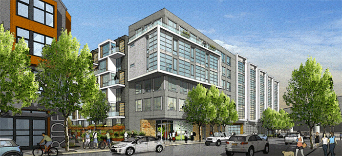 Developers’ renderings show two sleek — if generic — buildings hemmed by a leafy promenade at ground level. The complex would include parking for 388 cars and 455 bikes, as well as retail space. Save the Hill opposes the project on the grounds that it would mean more traffic, loss of historic buildings, excessive density, and the exposure of contaminated soil. The group’s website calls the structure “unnecessarily tall, wide, and contextually inappropriate,” and further compares it to “an ocean liner parked in a marina full of sail boats.”