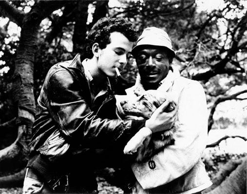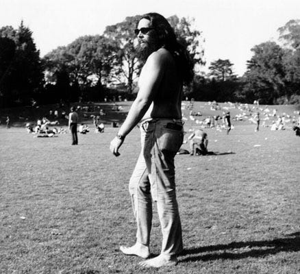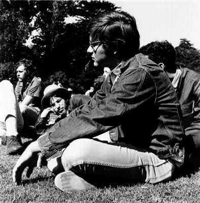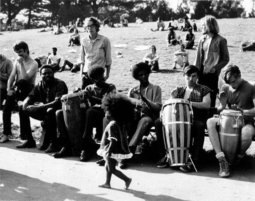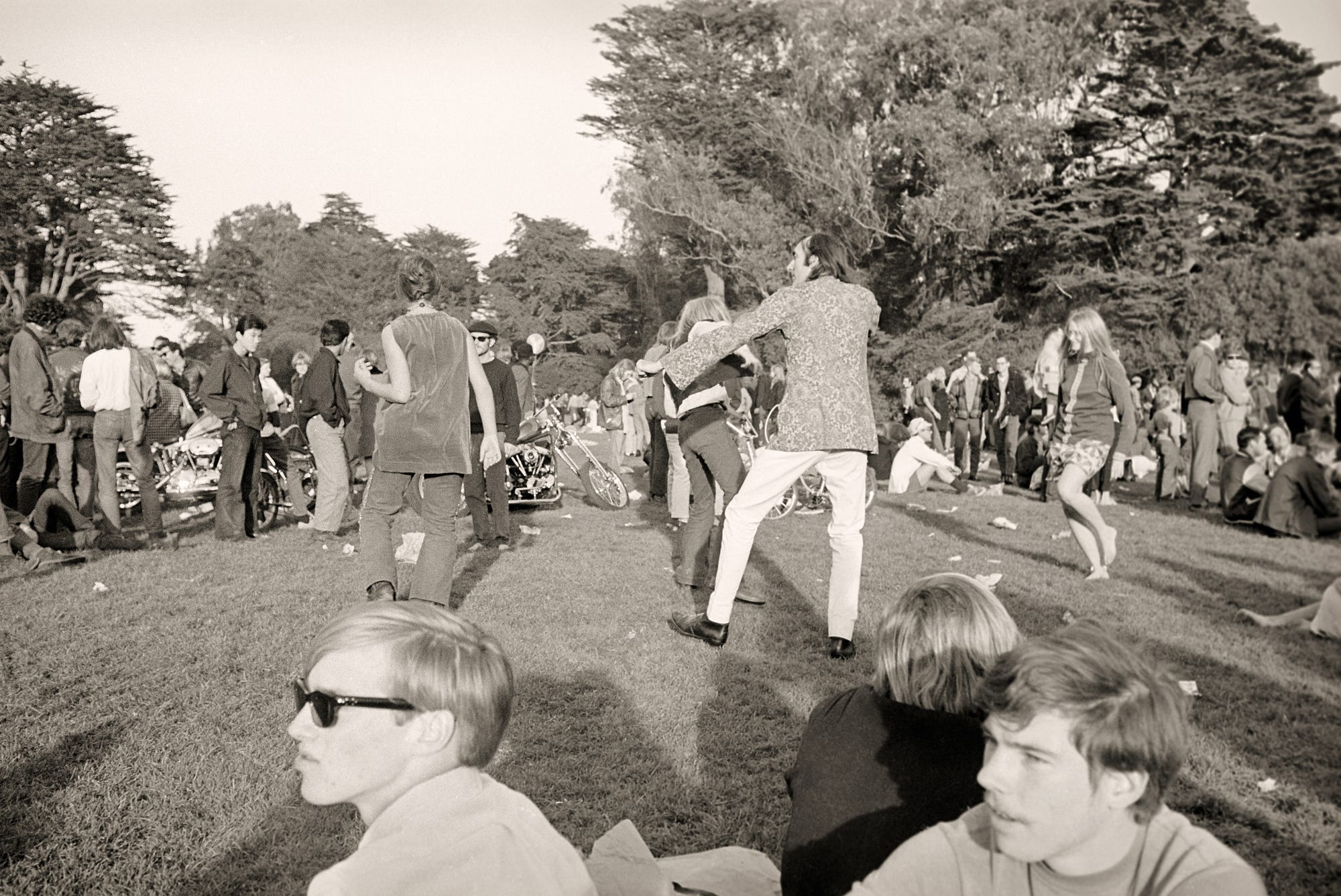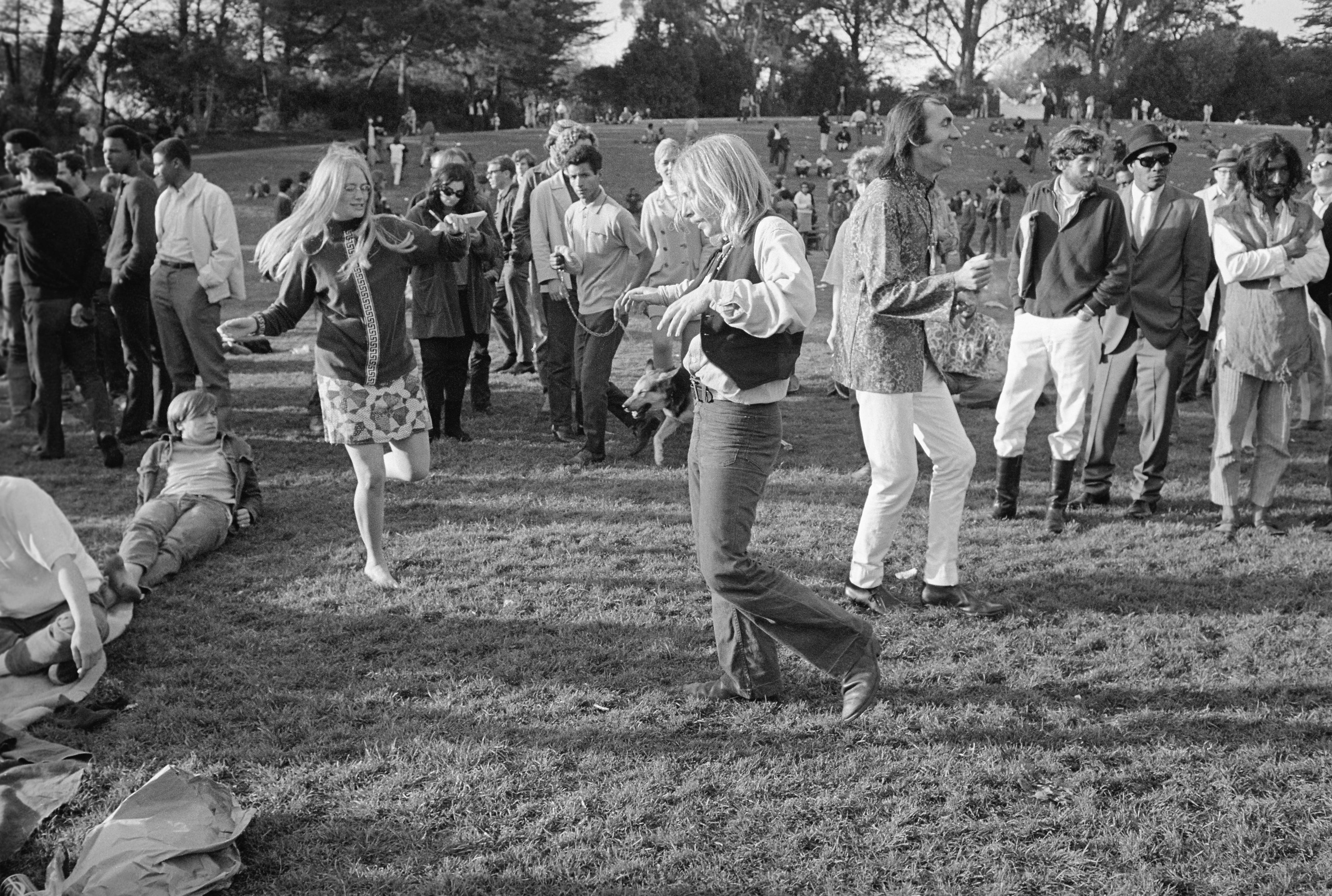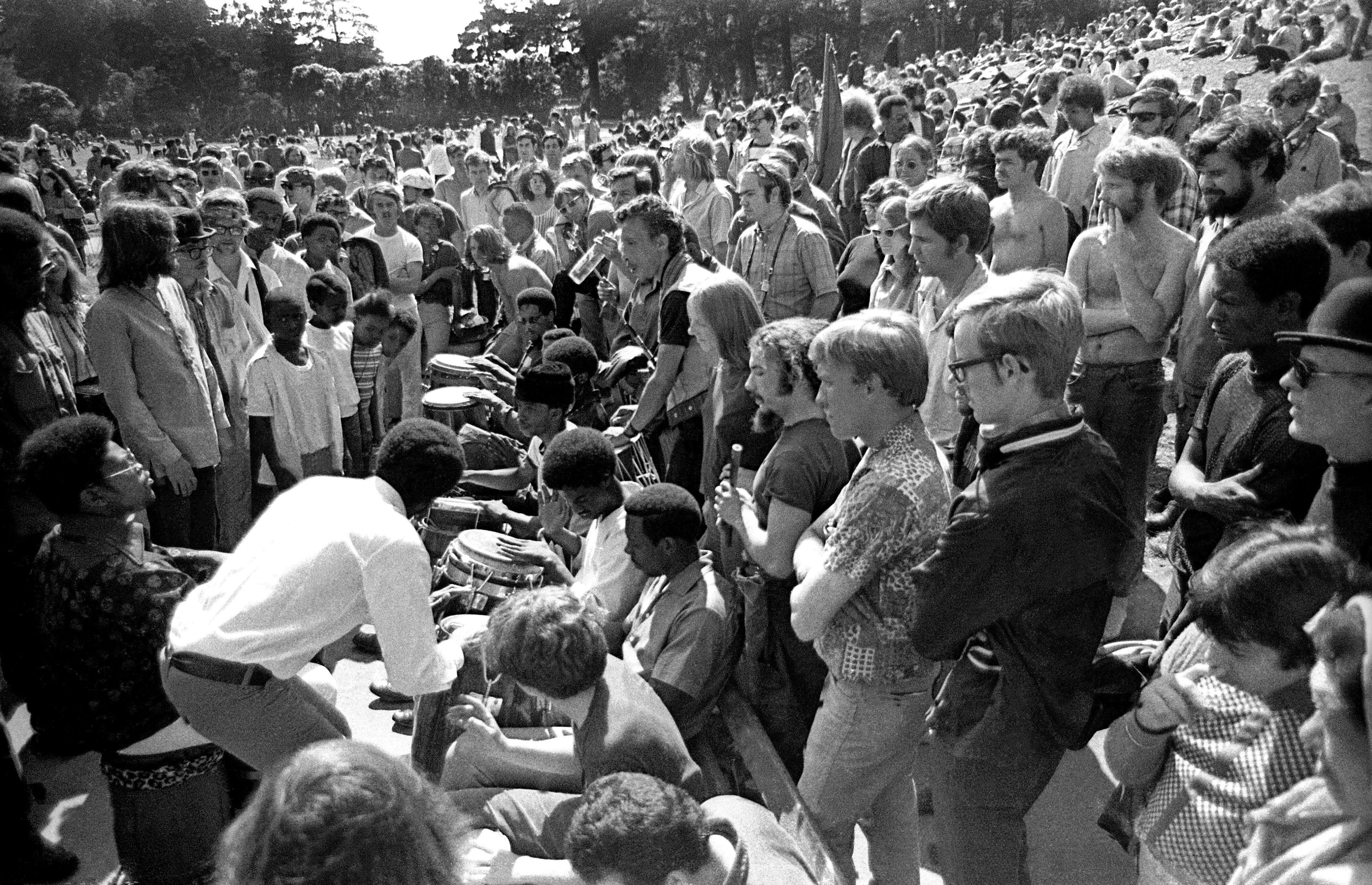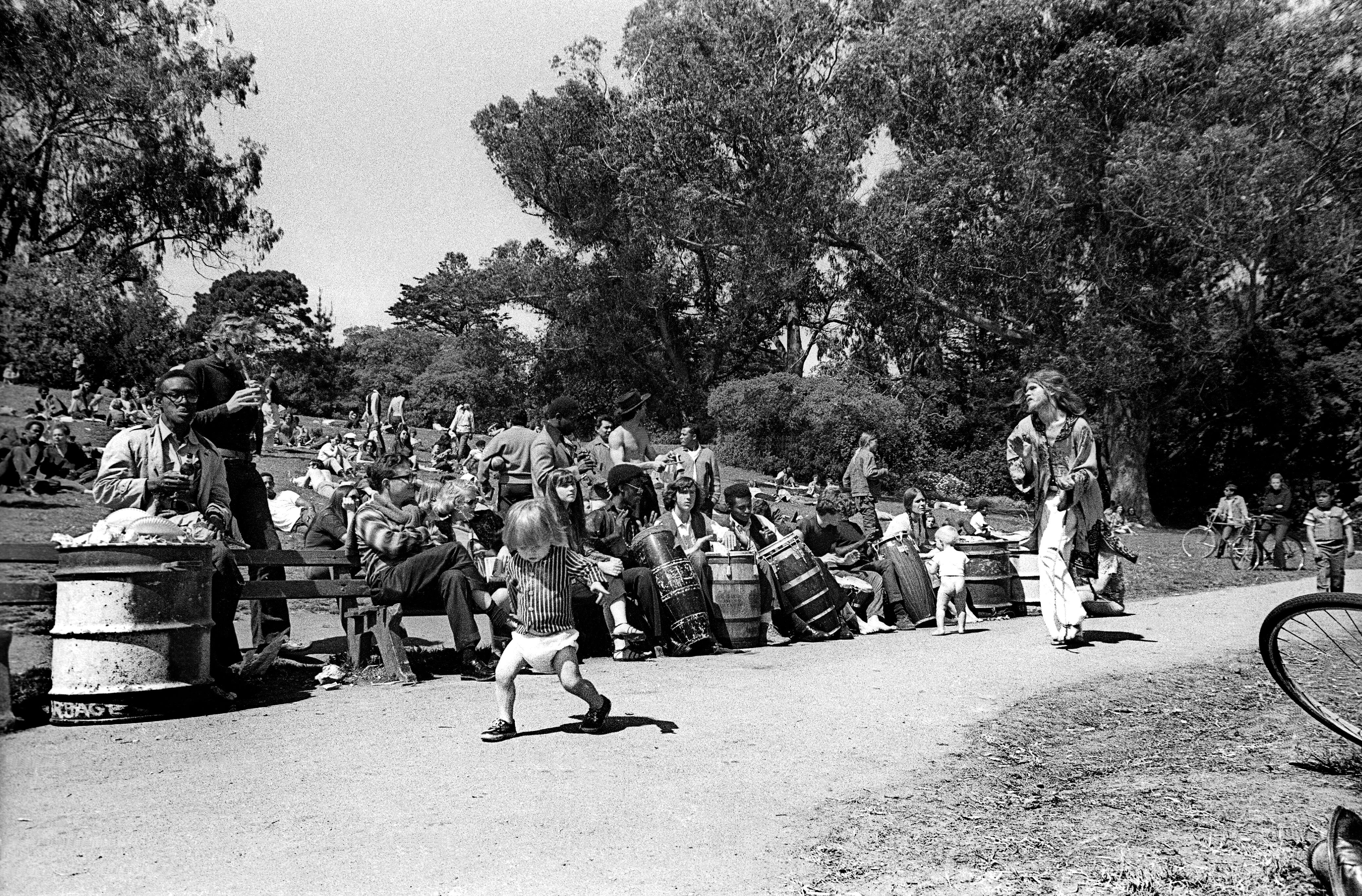 Groovy, baby. People dance on Hippie Hill in 1968. Photo: Bettmann/Getty Images Archives[Left]: Man walking across Sharon Meadows with Hippie Hill in the background in 1969. [Right]: Musicians playing on a bench while a child walks by barefoot. Photos: Mary Anne Kramer via San Francisco History Center, SF Public LibraryA group of drummers plays for a large hippie crowd on April 20, 1969. Photo: Robert Altman, Michael Ochs Archives/Getty Images[Left] Hippie Hill in distance, behind Sharon Meadows, 1967. Photo: San Francisco History Center, SF Public Library [Right]: A group sings together. Photo: FoundSF[Left] A man sits and listens to a band. [Right] Two men embrace a dog. Photos: San Francisco History Center, SF Public LibraryHibiscus of the Cockettes, an American theatre group, dances with a baby on Hippie Hill at Golden Gate Park on April 20, 1969, in San Francisco, California. Photo: Robert Altman/Michael Ochs Archives/Getty Images