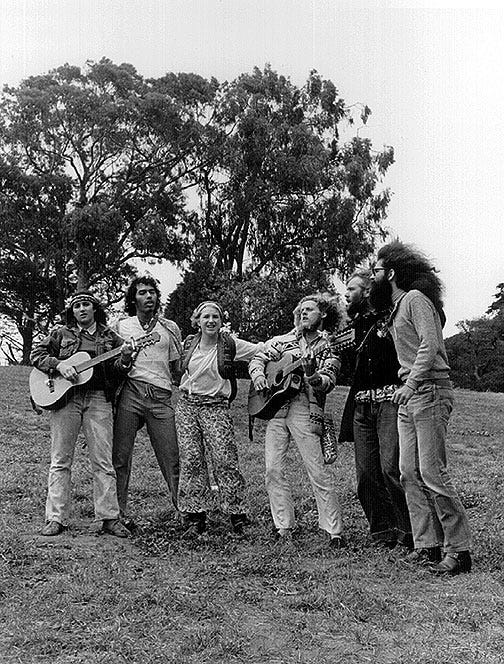 Hundreds of flower children gathered on Hippie Hill in the 1960s. On this day, most of the hippies there sat and listened to the bands that were playing, but some, like this trio here, couldn’t help but dance. Photo: Bettmann/Getty Archives