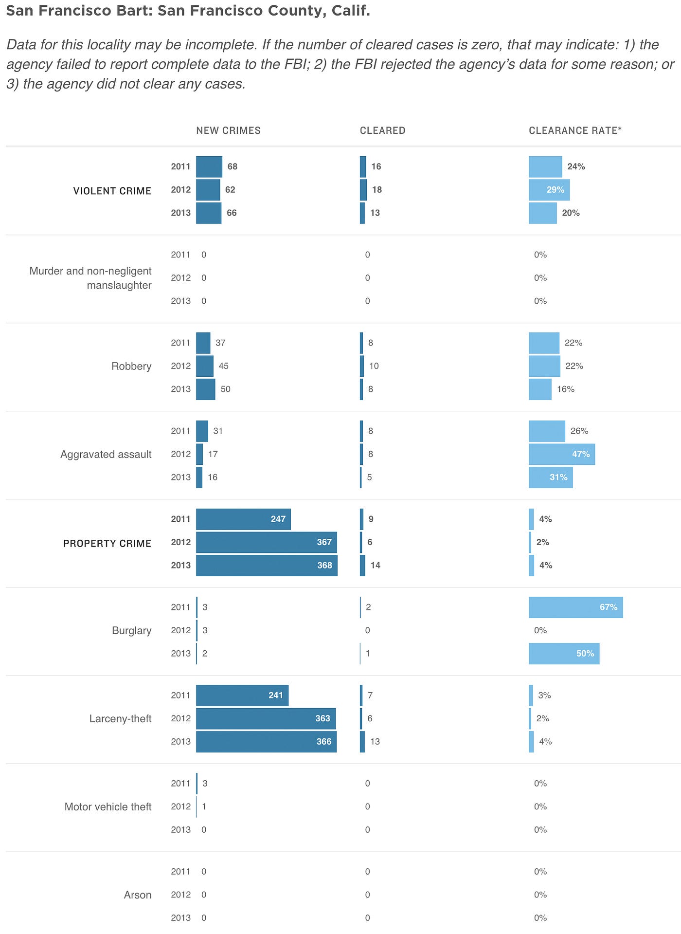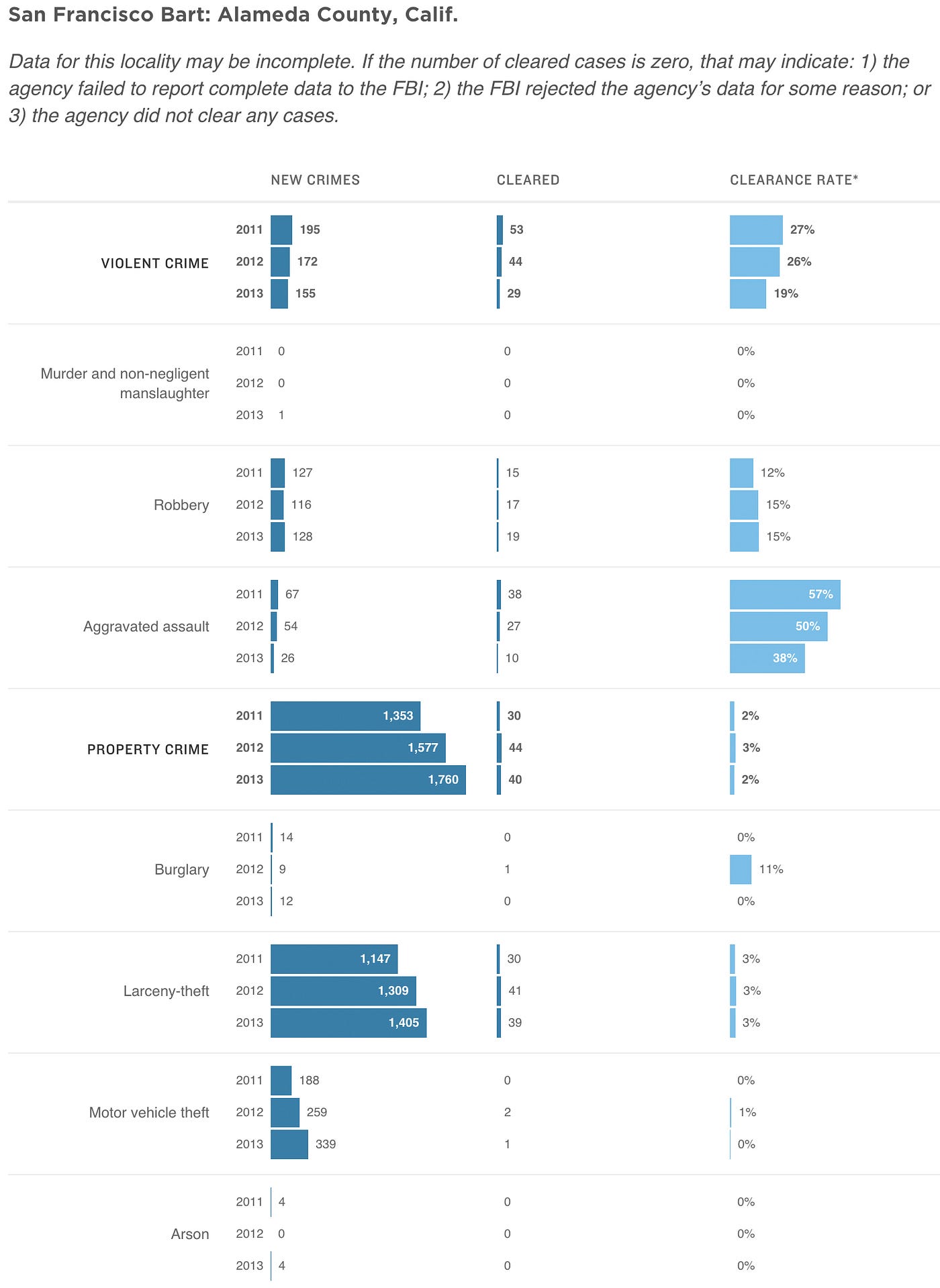 While riding BART is usually just a health hazard, it’s also occasionally a safety one as well. The last time the agency reported a clearance rate over 50 percent was in 2011 (for burglaries in San Francisco).