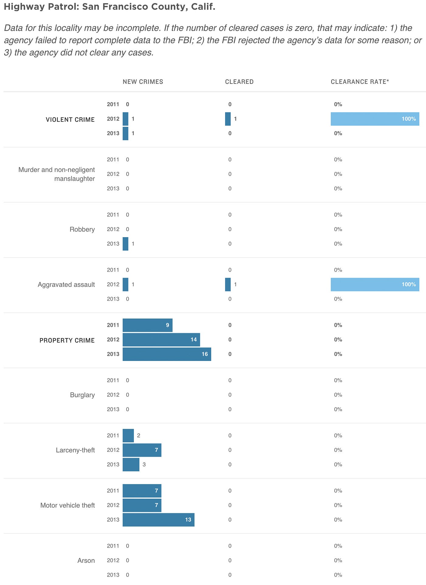 Meanwhile, the Highway Patrol in San Francisco County is doing poorly when it comes to solving crimes related to theft, although the actual number of such crimes is low.