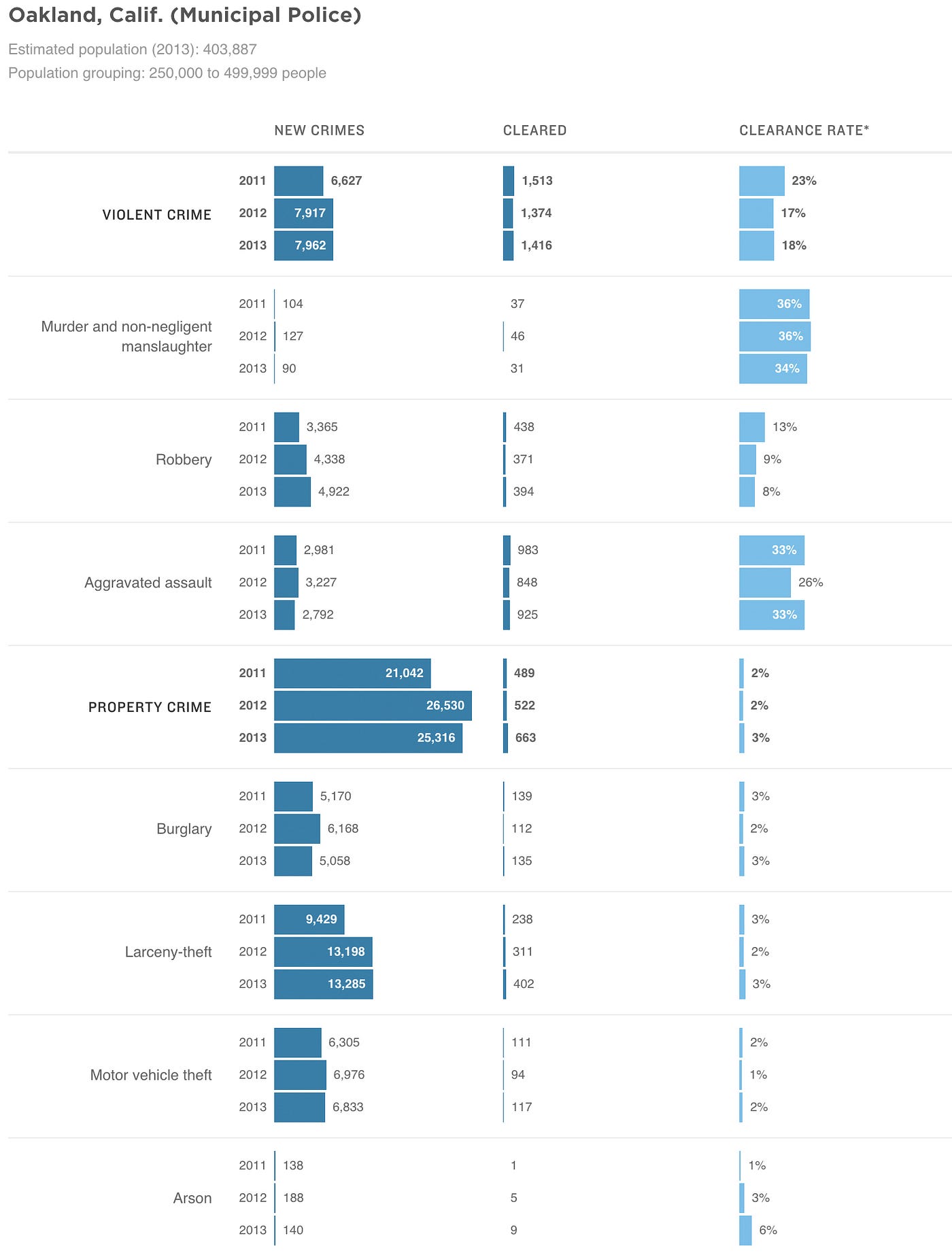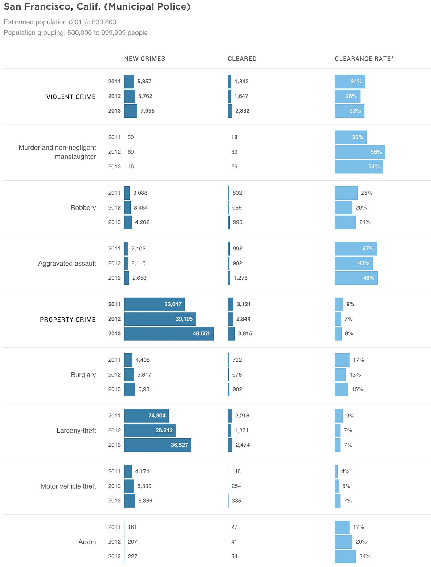 In San Francisco, burglary, property crime, larceny, and car theft yield some of the lowest clearance rates. Murder and manslaughter saw just over half of cases cleared in 2012 and 2013. In the latter year, the SFPD only solved one of every two homicides. Meanwhile, in Oakland, no clearance rate made it to 50 percent, and the total number of violent crimes recorded was higher than in SF year-over-year.