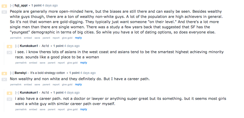There are a lot of Asian “high achievers” in the Bay Area, but the women here want to date only a “white guy.”