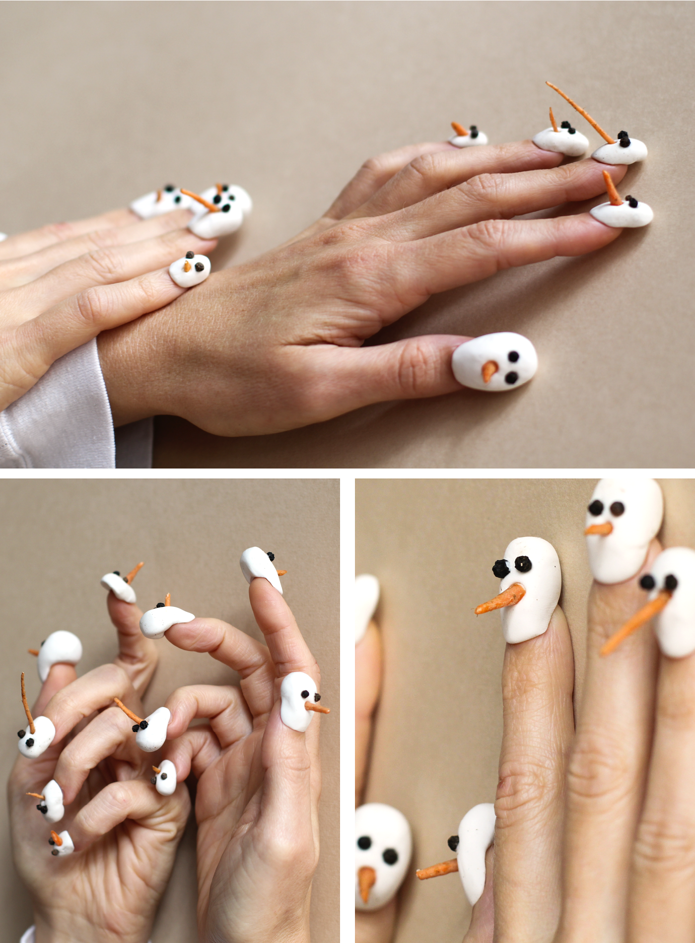 This is a fun, everyday look that kids will love. Unlike a real snowman, these nails will not melt; however, you might want to spritz the carrot noses with water to keep them firm.
