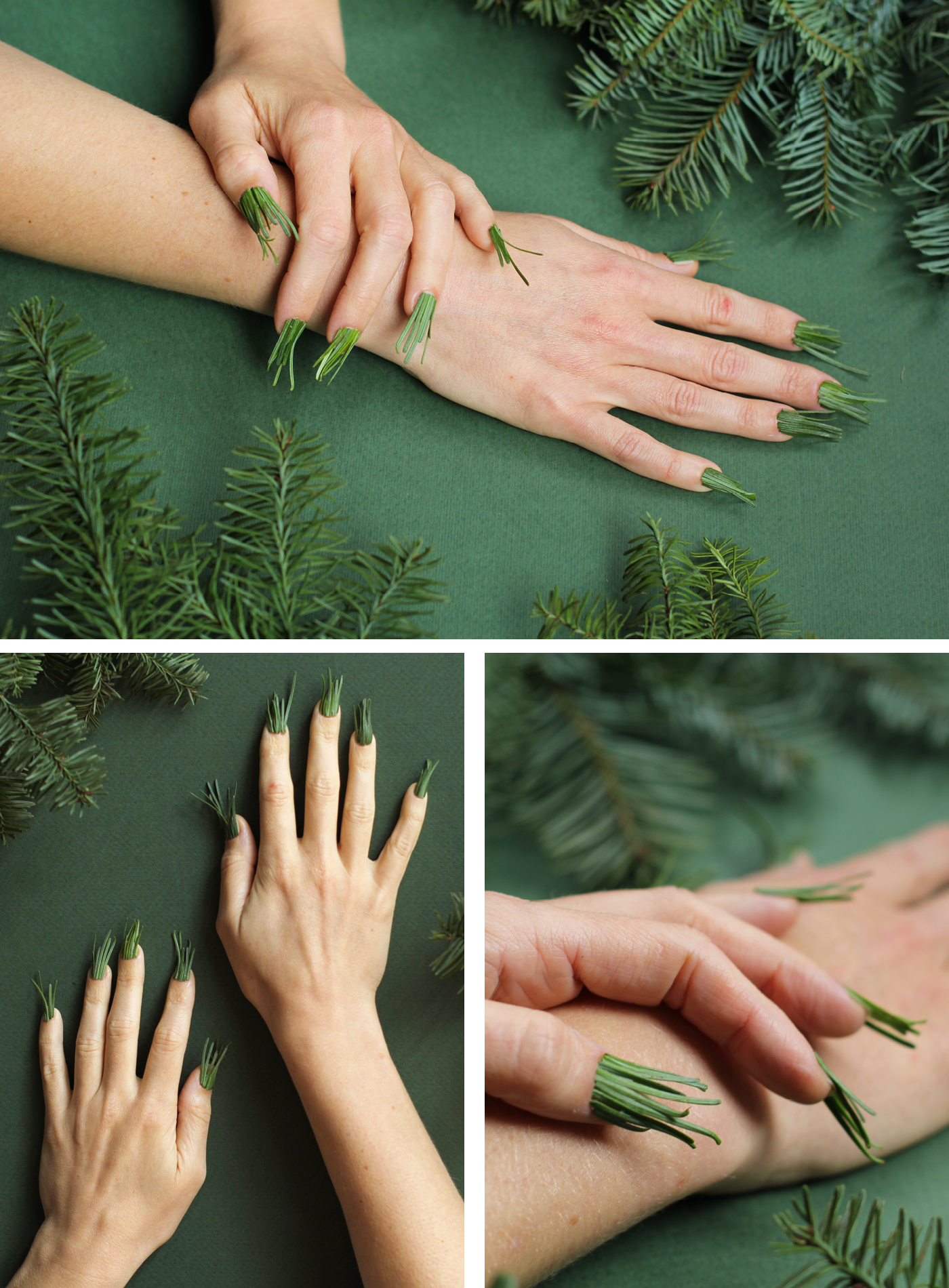 Add some sap to your snap! For this elegant and affordable look, I simply glued needles from my tree straight to the nail. Don’t worry about them lining up at the top; the frayed look is really in right now. For the full Christmas-tree effect, leave them on and let them wither through mid-January.