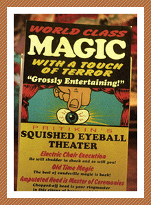 He’s been a magician, wowing visitors to his now closed Mansions Hotel in Pacific Heights (another bizarre mix of opulence and ephemera, complete with its own mural) and his Squished Eyeball Theater, which holds what I can only hope is the only life-like replica of an electric chair (smoking, writhing and screaming rubber victim included). He’s also the self-titled Foremost Classical Saw Player in America and judging by the competition (or lack thereof), we’re not putting up an argument.
