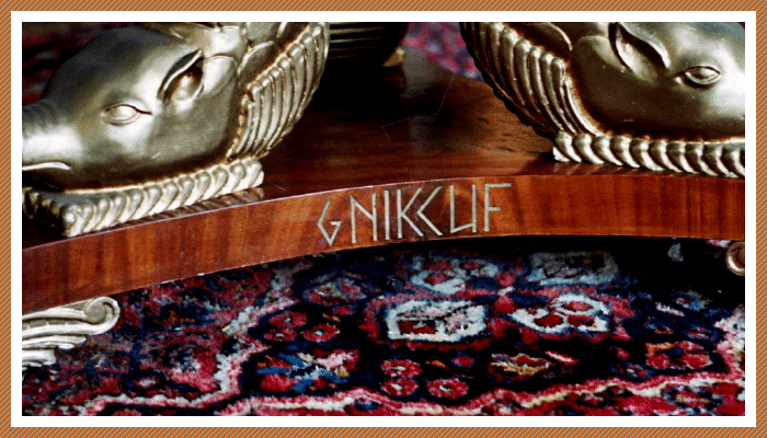 To one side of the sweeping staircase is a collection of work by Beniamino Bufano, quite possibly one of the last artists one would think of in terms of household décor. Of course, the average person probably wouldn’t put Hitler’s globe and armband in the other wing, or dedicate a wall to Herb Caen (the former given a placard with the words “May The Bastard Rot In Hell” underneath, the latter a much gentler sentiment). The old FAO Schwarz clock has found a home overlooking the library, not far from a quilt handmade from thousands of colorfully patterned Barbie-sized shower caps. Oddball touches can be found hiding everywhere: the legs of one table are gilded pigs feet set around the inscription “suoegrog gnikcuf era sgip” (you can try that one backwards, even without a record player).