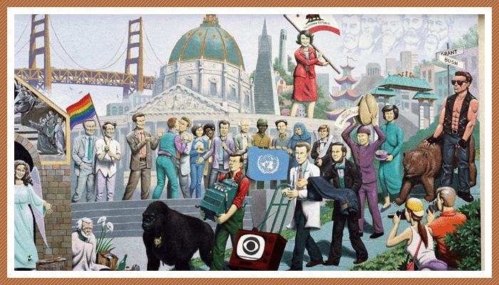 In one corner, Marilyn Monroe and Joe DiMaggio ride a giraffe while famed SF stripper Carol Doda (naturally, in her state of bosomed undress) straddles a zebra. Gavin Newsom applauds gay marriage while Harvey Milk hugs it out. The Governator prefers the company of a bear. Even Koko and her kitten get a nod next to Levi Strauss, Philo Farnsworth (pushing a little invention known as television) and an equally important San Francisco contribution: the fortune cookie. It’s one big Technicolor history lesson.