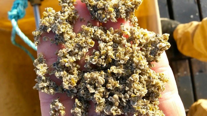 Larvae is collected and grown into seedom in a hatchery. Hog Island doesn’t currently have a hatchery to call its own, and instead receives shipments of seed from Washington and Hawaii. While at the hatchery, larvae is “set,” or placed in a heated seawater tank that allows each future shooter to attach to a surface, usually a perforated strip of plastic. The larvae are fed different types of algae as they mature and begin to develop a shell.