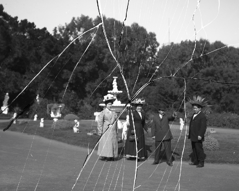 Because the negatives are over 100 years old and printed on thin glass, though, they can be quite fragile. We recently purchased an 8"x10" glass plate negative, identified as depicting a Japanese family in Sutro Heights in San Francisco, for my company’s internal archive, but it was damaged in transit before it could be scanned. The photo was historically significant, though, so we decided to restore it.
