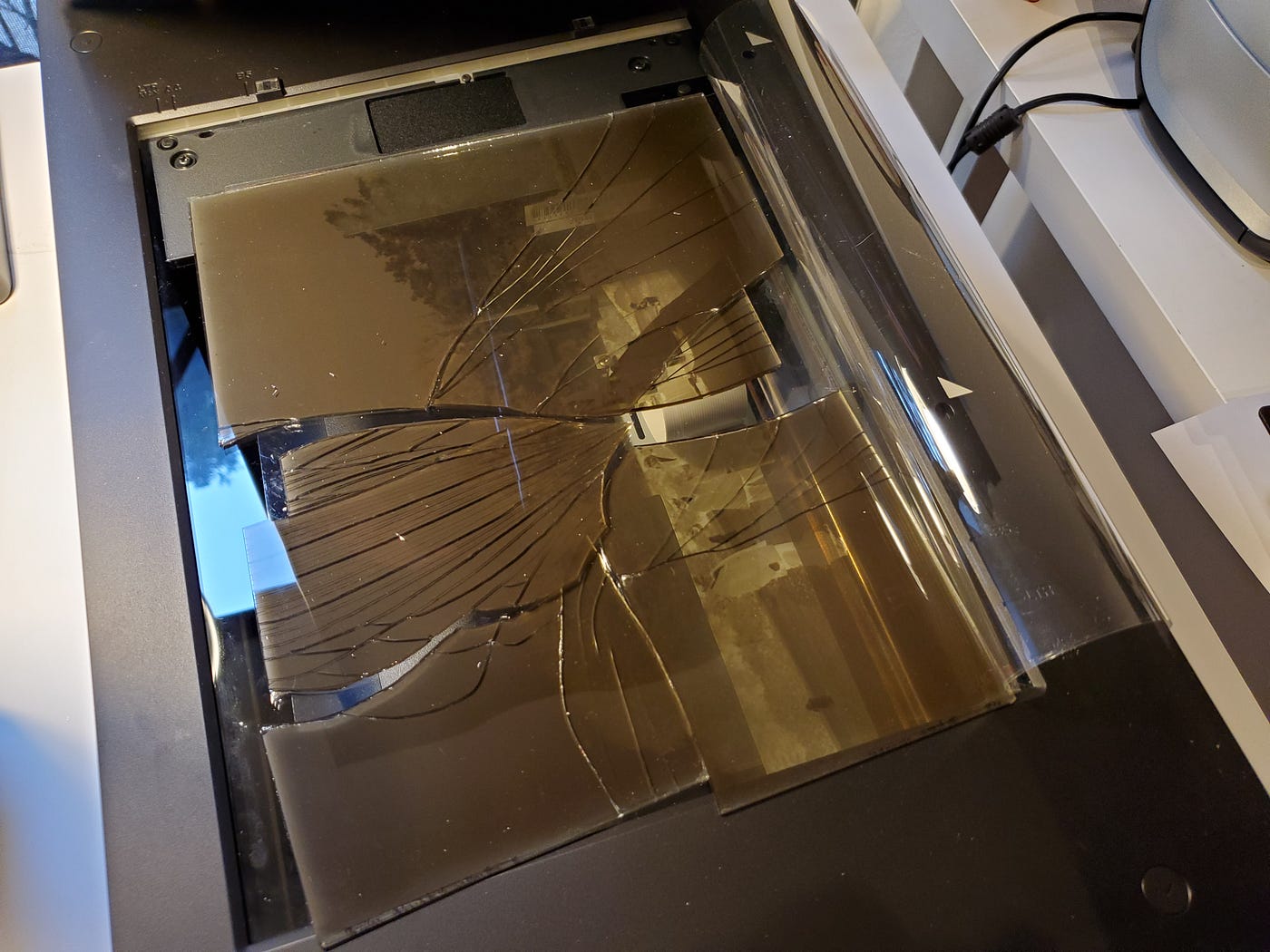 After reassembling the pieces, everything was in approximately the right place, although the cracks were still there. I covered the broken plate with plastic to hold everything somewhat in place and then scanned it at a high resolution on the flatbed.