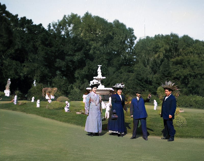 My next step was to determine exactly where the photo was shot. The statues in the background look distinctive, so I started by looking for images of statues in the Sutro Heights area from the same time period. I found this shot from the Western Neighborhoods Project showing the exact same location. It’s the carriage circle in Sutro Heights, which is now Sutro Heights Park. SFGate has a fascinating story about the park’s history.