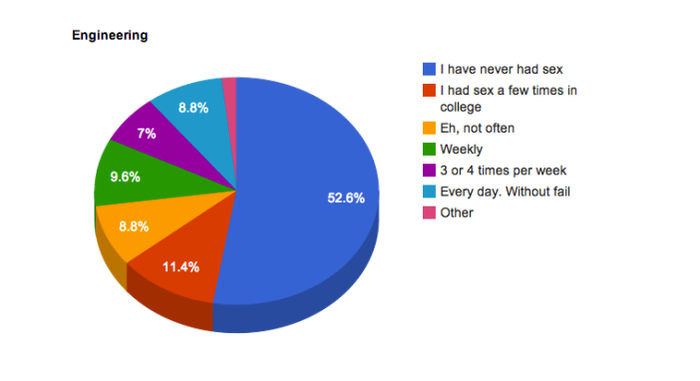 UC Berkeley’s Daily Clog recently ran a poll asking students their majors and how much sex they have. No, The Clog wasn’t doing any deep anthropological research, they were just curious if “any humorous correlations appeared.” (I’m not judging — I’m a big fan of silly polls for the sake of shits and giggles.) Still, the poll revealed some interesting data. The most surprising info from the survey is that kids aren’t doing it as much as you’d think — of the 732 Cal students who were polled, 35% admitted they’d never had sex. Seems like a lot of virgins, right?